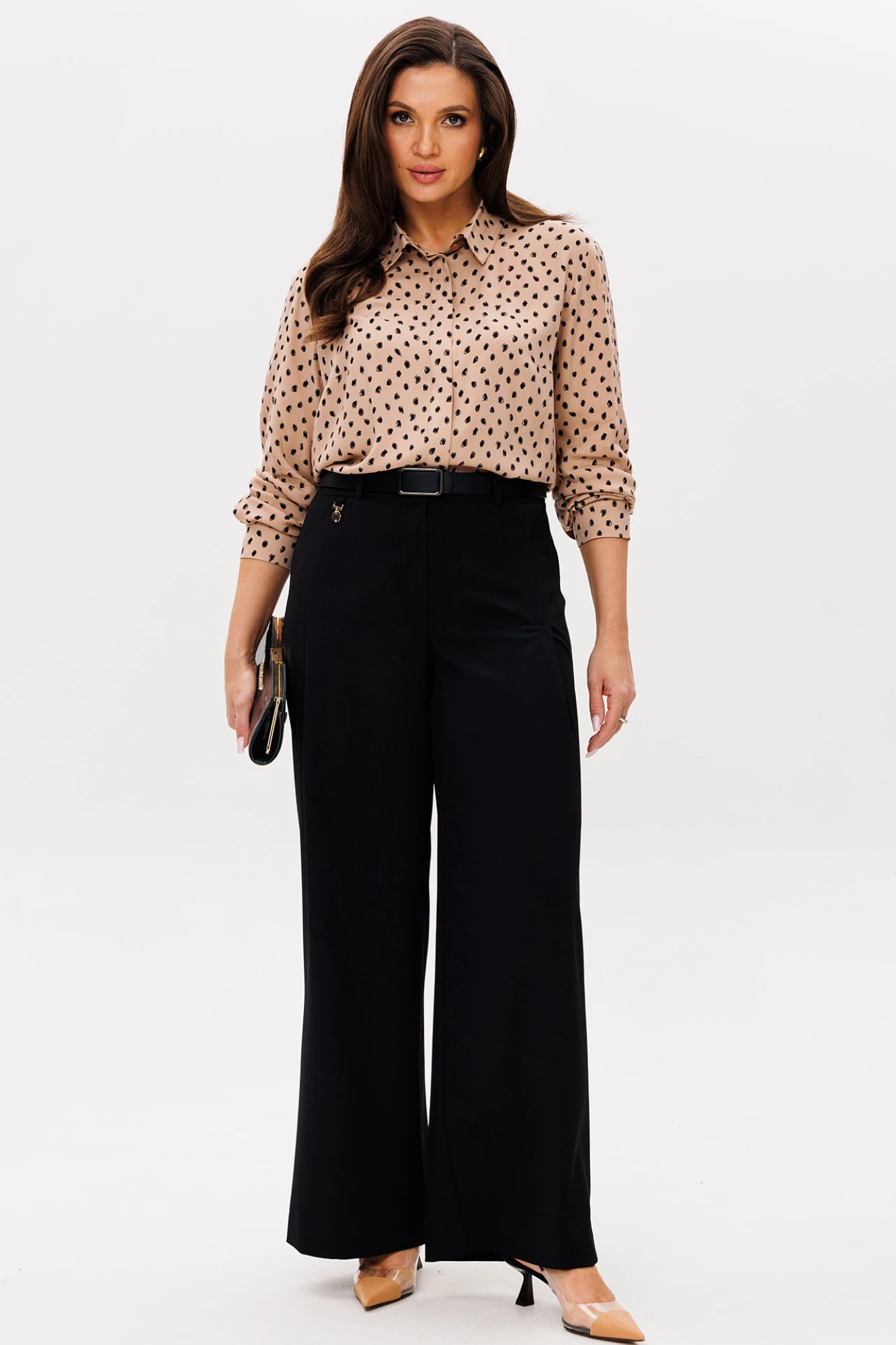 Брюки женские свободного силуэта с высокой посадкой, максимальным расширением от бедра (палаццо). Брюки на притачном поясе. По переду складки в центрах половинок брюк и застёжка на молнию с гульфиком и откоском. Талевые вытачки по задним половинкам брюк.