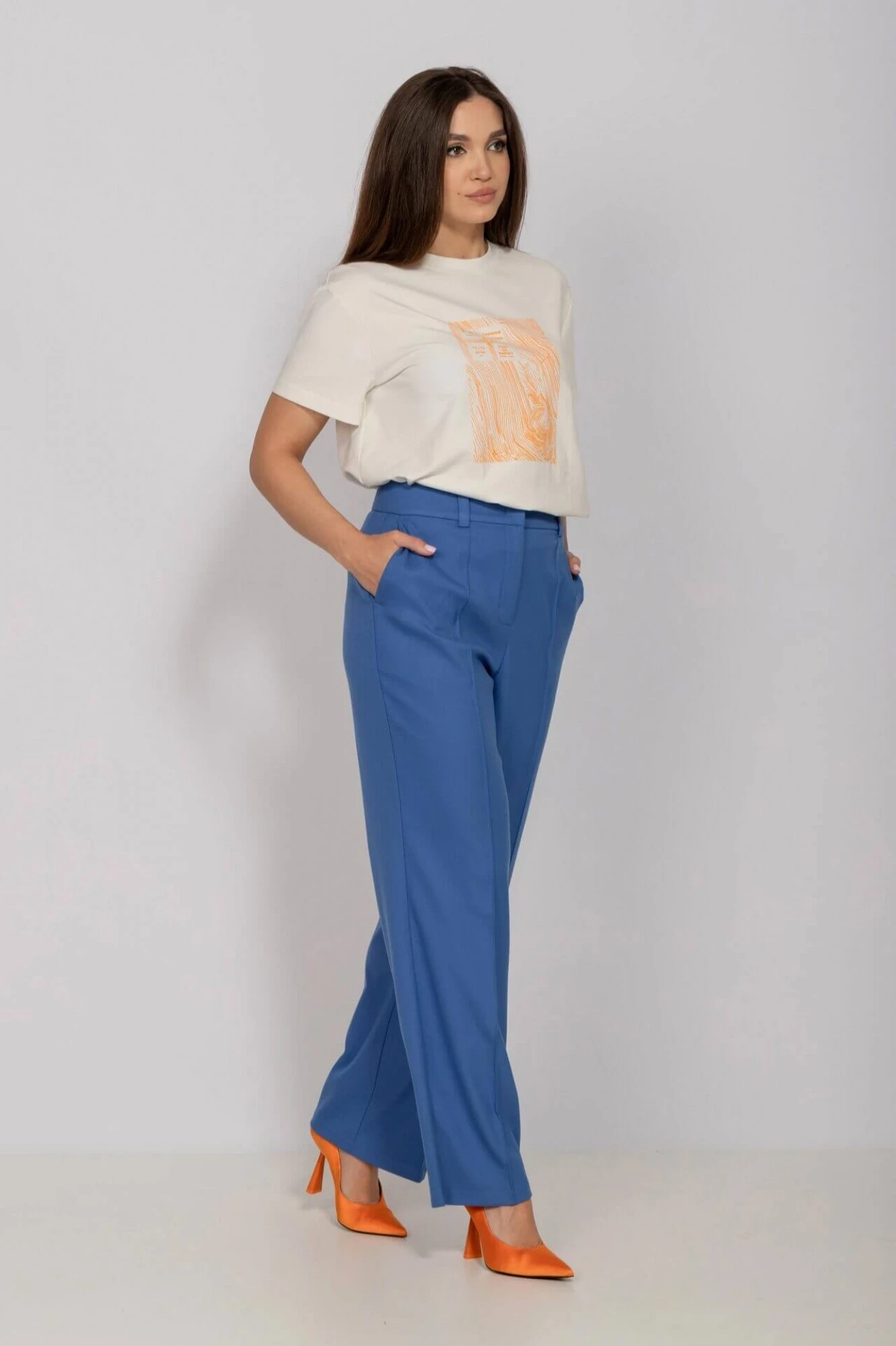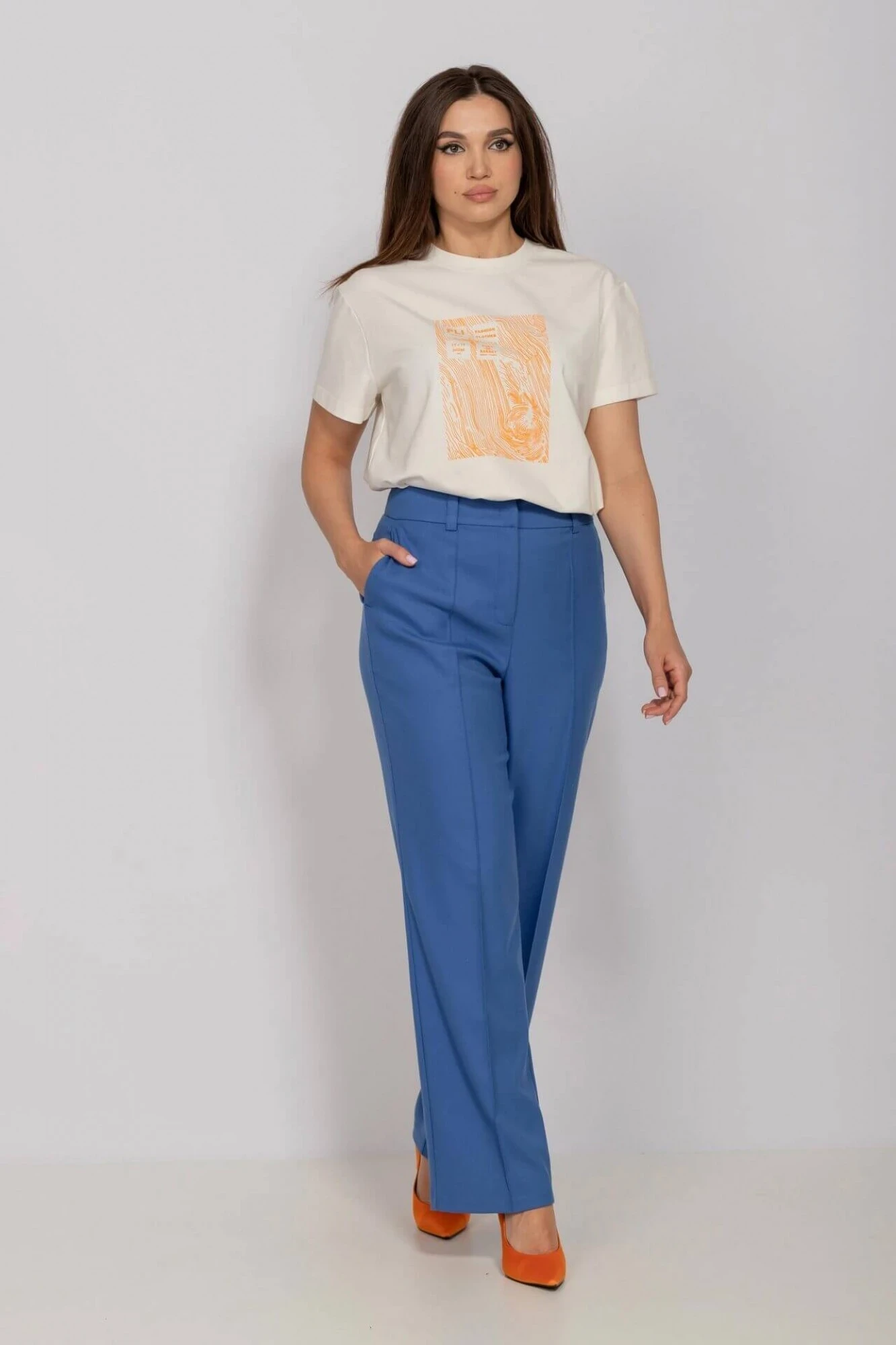 Брюки женские с высокой посадкой, прямые, на притачном поясе, выполнены из однотонной ткани. Передние части брюк с застроченным кантом и боковыми карманами. На задних частях брюк по талевые вытачки и имитация карманов в рамку. Застёжка молния с откоском в серединном шве передней части изделия. Пояс застёгивается на два крючка.