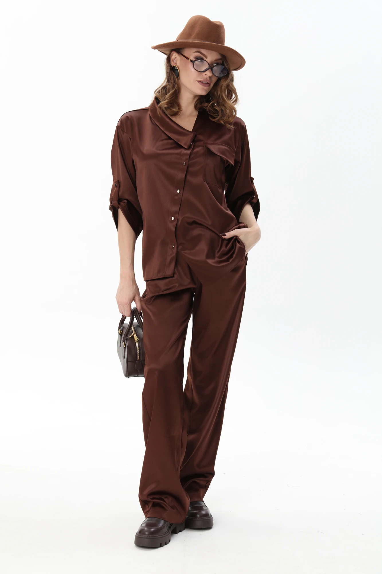 Брюки свободного кроя из гладкой ткани сочетают элегантность и комфорт. Широкая резинка на поясе и наличие функциональных карманов подчеркивают удобство модели.