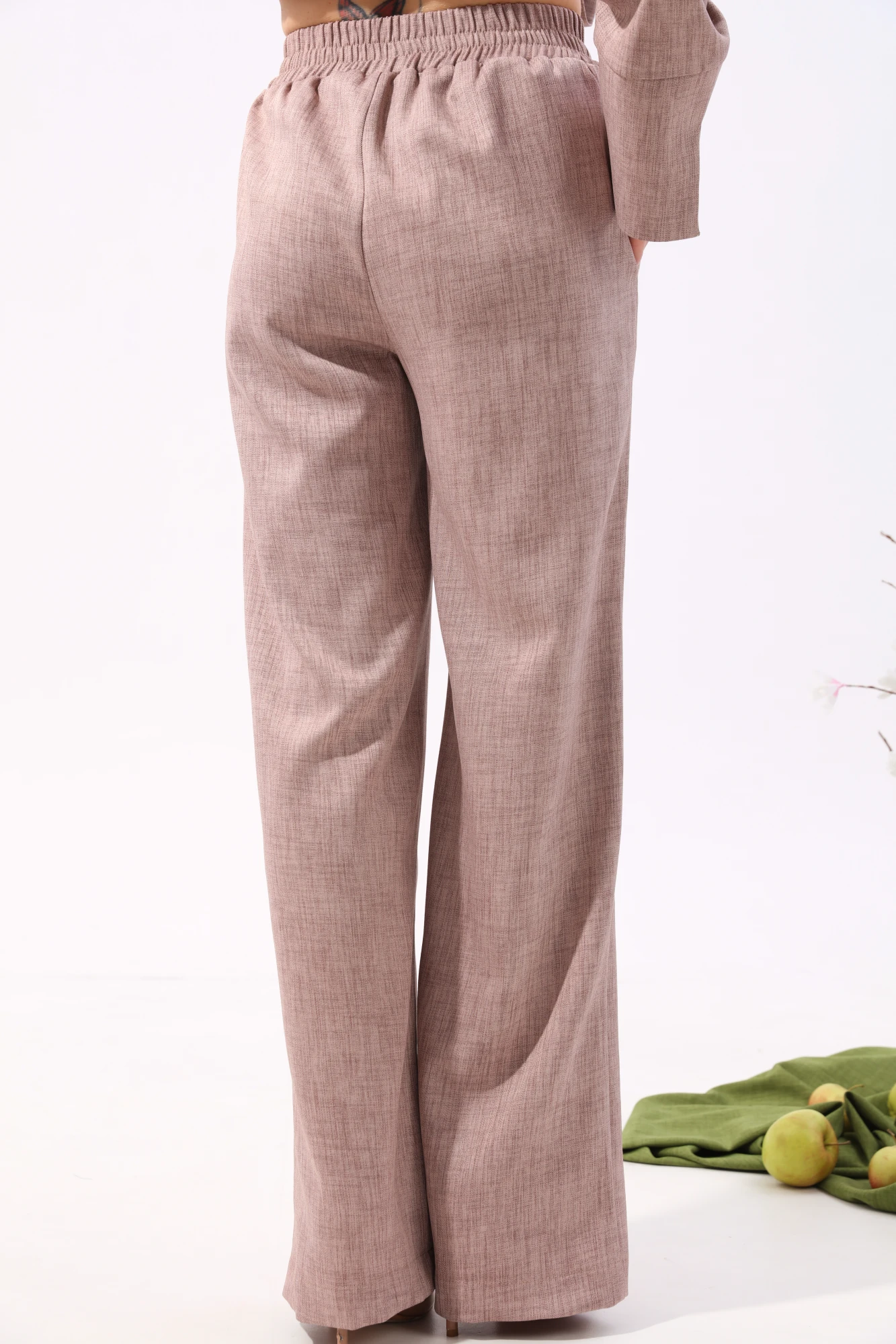 Брюки свободного кроя, верхний срез представлен широкой резинкой, с карманами.