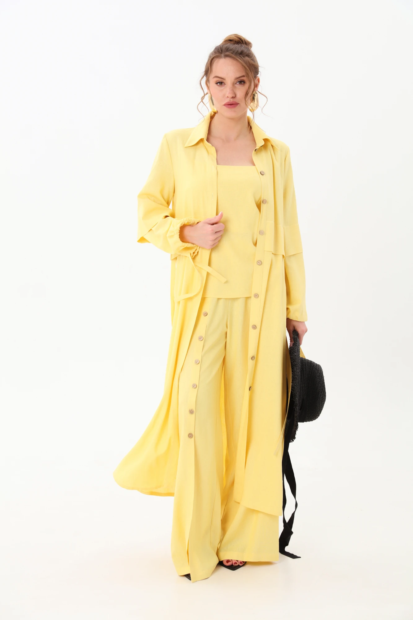Брюки свободного кроя, верхний срез представлен широкой резинкой, с карманами. По центру правой брючины расположена планка с функционирующими петлями и пуговицами.