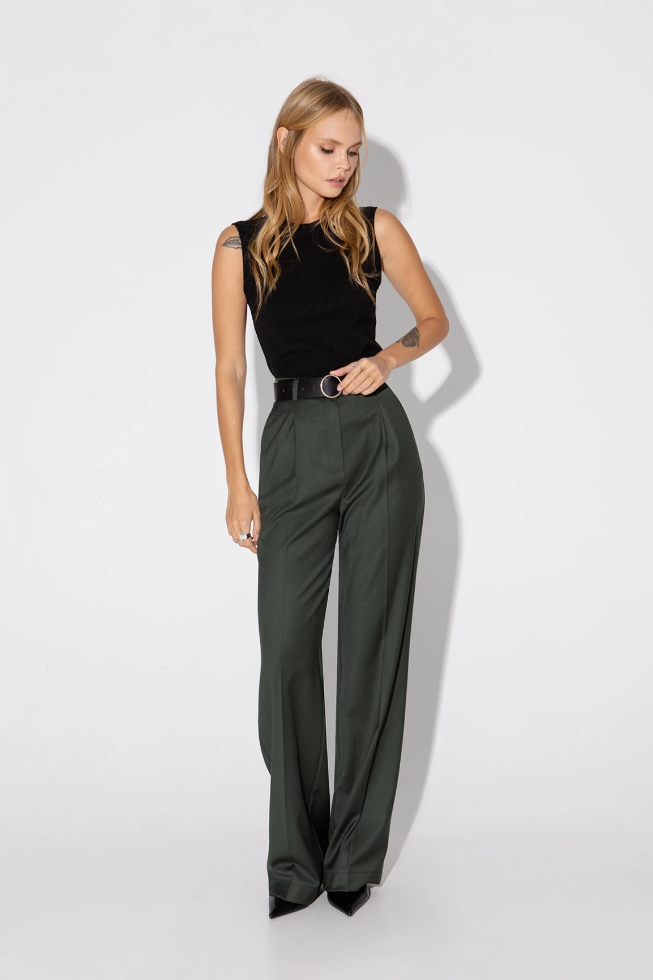 Текстильные брюки-палаццо с высокой посадкой. Детали: высокая посадка, широкие и длинные брюки, притачной пояс со шлевками, передние половины с небольшими застроченными мягкими складками и заутюженными стрелками, застежка на молнию и пуговицу, боковые карманы Длина брюк по боковому шву с поясом около 113 в размерах 40-46 и около 114,5 см в размерах 48-52