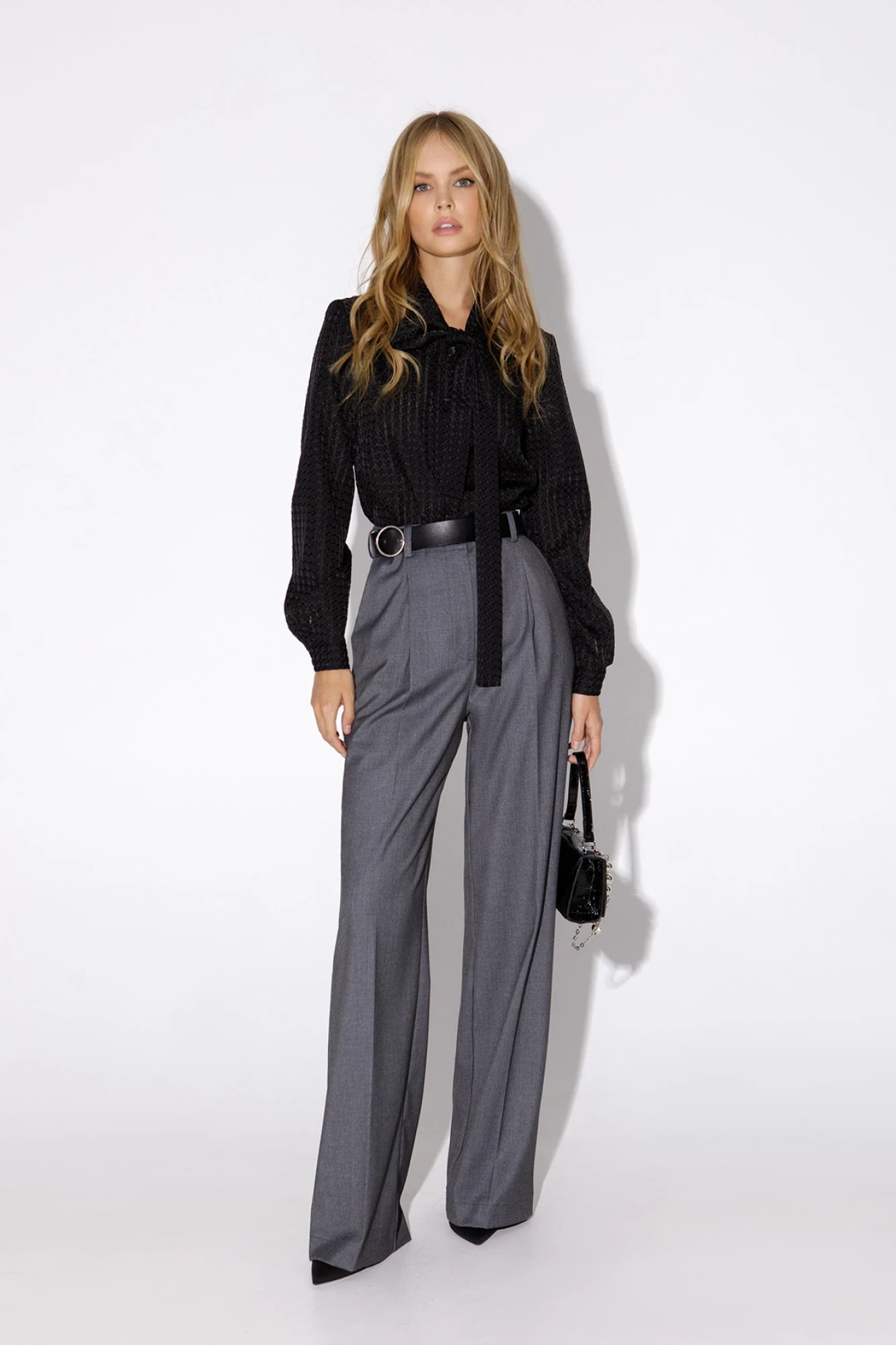 Текстильные брюки-палаццо с высокой посадкой. Детали: высокая посадка, широкие и длинные брюки, притачной пояс со шлевками, передние половины с небольшими застроченными мягкими складками и заутюженными стрелками, застежка на молнию и пуговицу, боковые карманы Длина брюк по боковому шву с поясом около 113 в размерах 40-46 и около 114,5 см в размерах 48-52