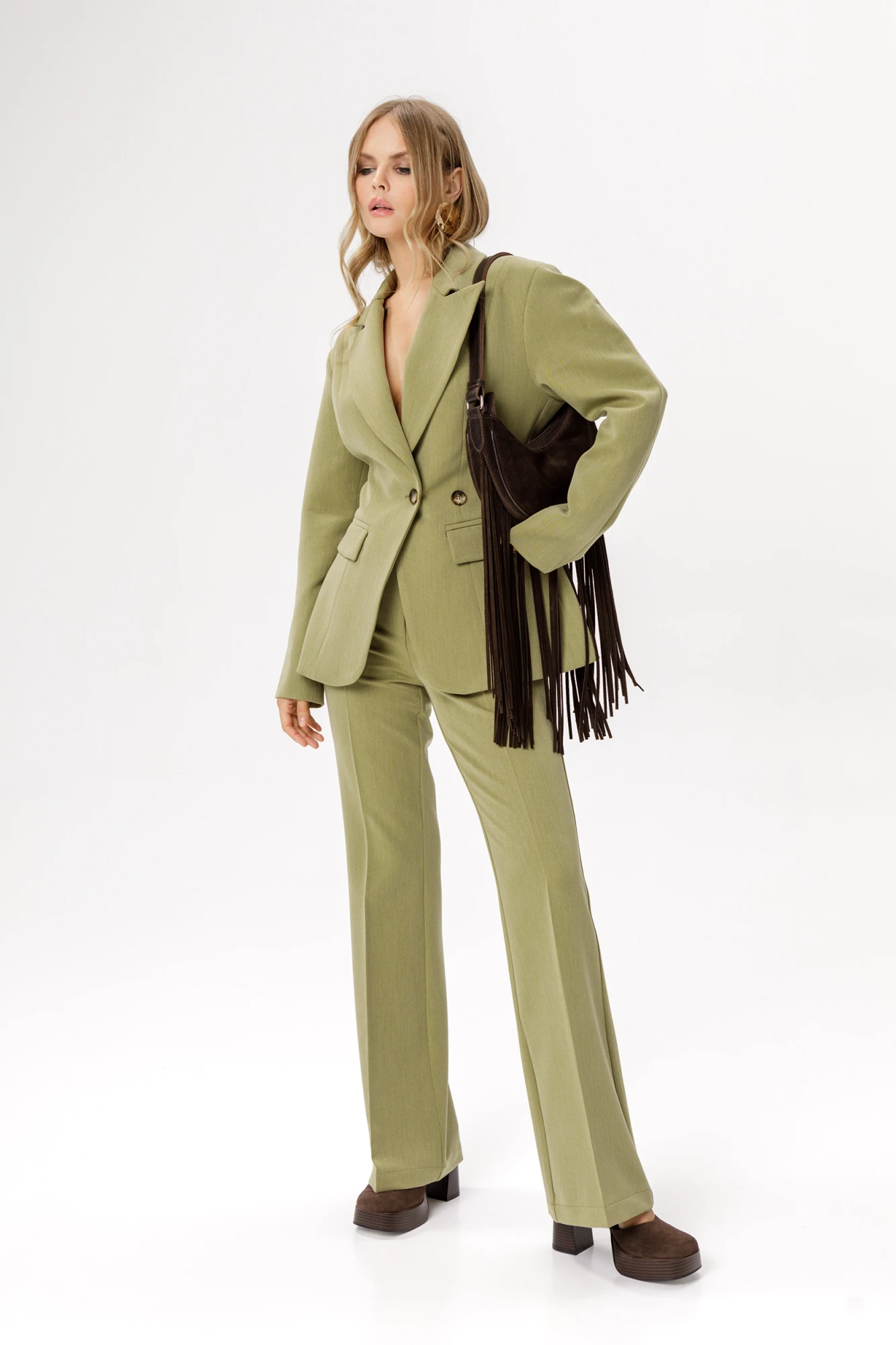 Детали: притачной пояс со шлевками, передние половины с заутюженными стрелками, застежка на молнию и потайные крючки, боковые карманы. Задние части брюк с вытачками и заутюженными стрелками. Пояс брюк без резинки.