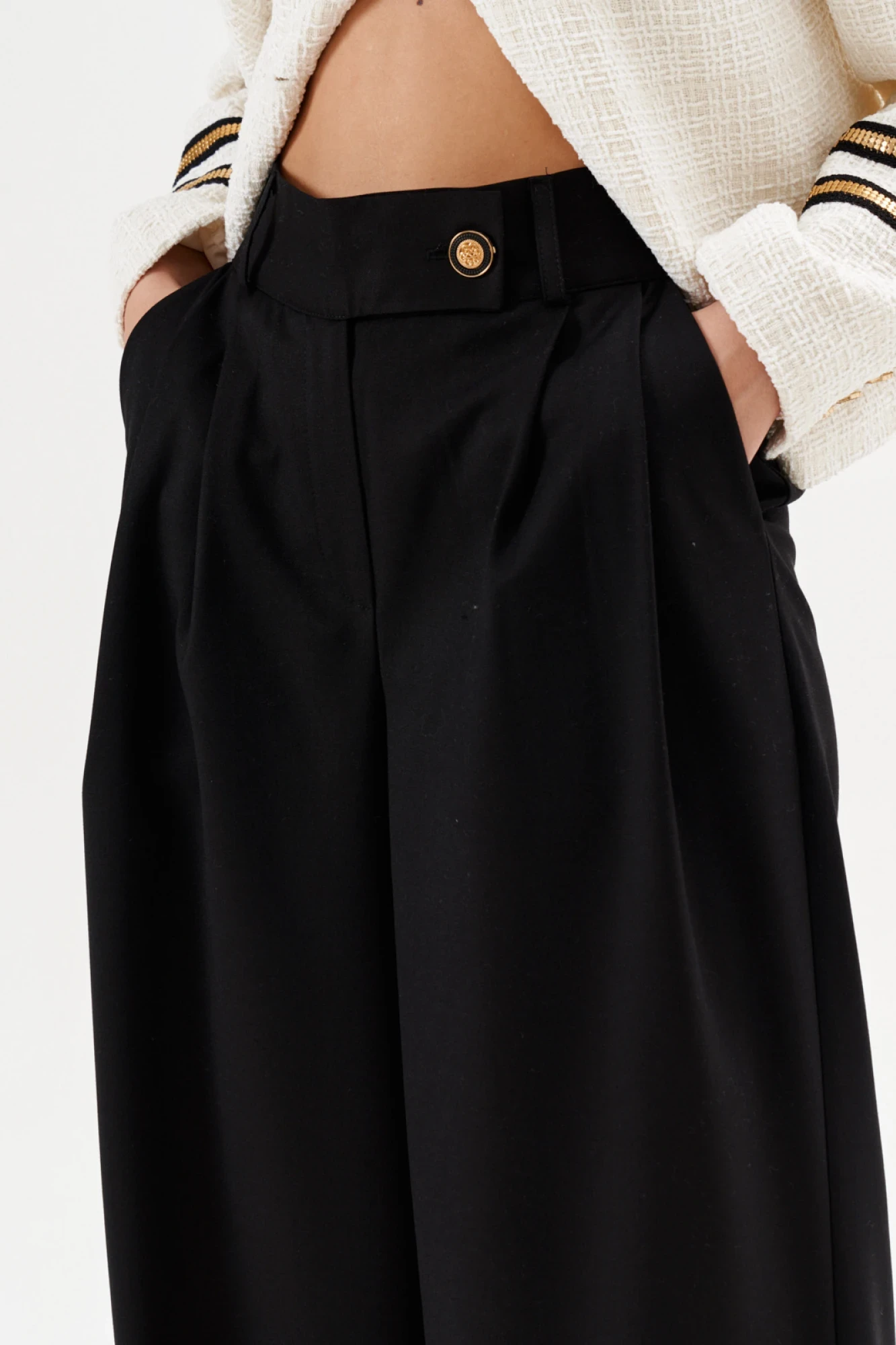 Брюки палаццо, длинные, на притачном поясе с частично вставленной резинкой. По задним половинкам талиевые вытачки. По передним половинкам заложены односторонние складки, обработаны боковые карманы с наклонным входом. Застежка с гульфиком и откоском на тесьму-«молнию». По поясу вставлены шлевки.