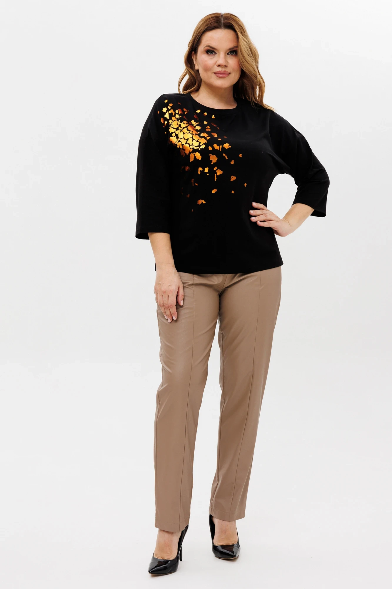 Брюки женские из эко-кожи с карманами. Изнаночная сторона кожи вискозная. По центру передней и задней половинок расположены швы. Верх брюк обработан притачным поясом со шлевками.