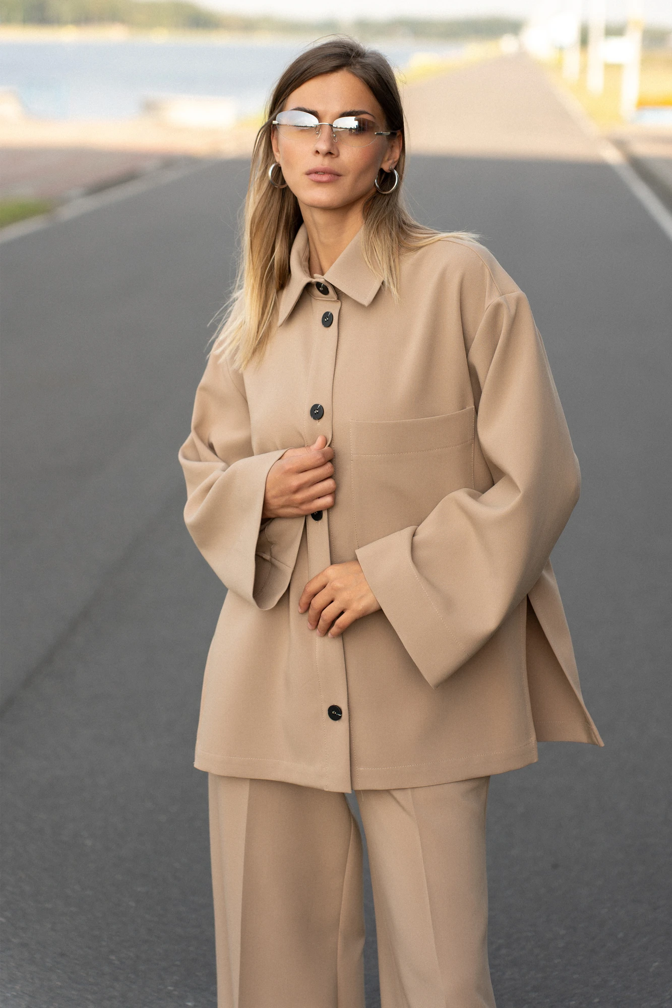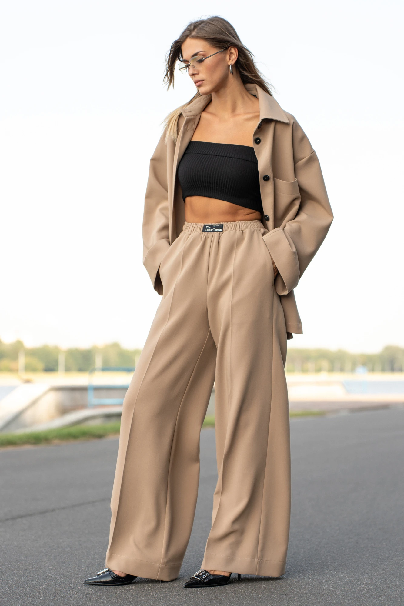 Брюки в цвете "Camel" прямого свободного силуэта. Пояс на резинке, по переду боковые наклонные карманы. На поясе декор в виде нашивки с лого. Длина брюк по боковому шву с поясом 108 см.