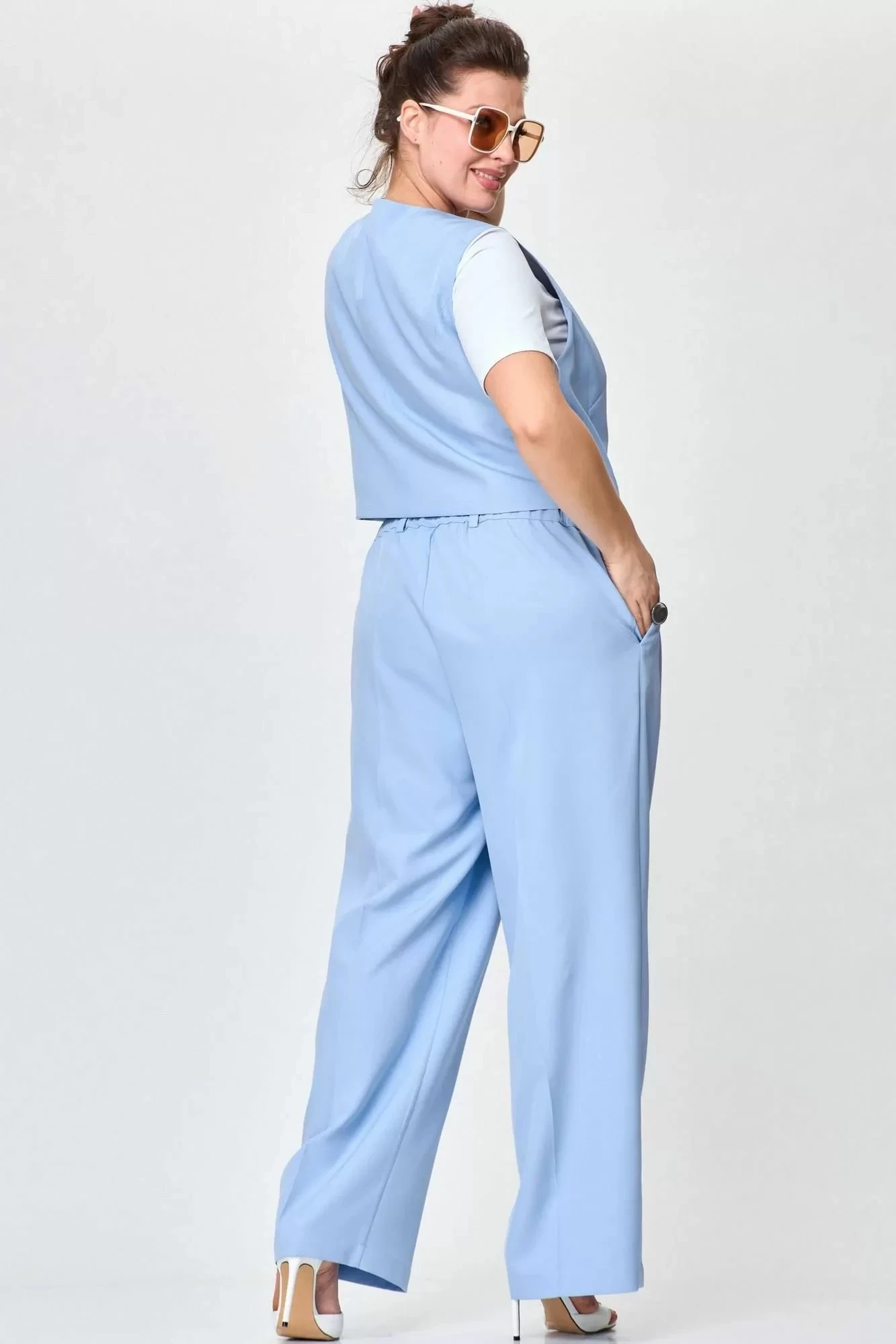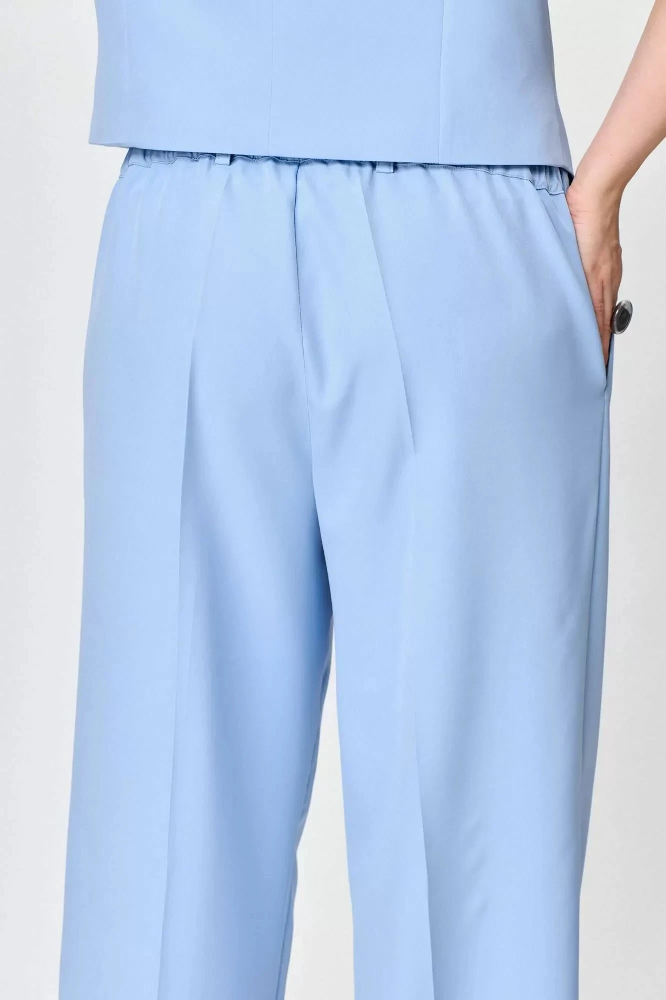 Брюки палаццо выполнены из костюмной ткани. Брюки со складкой. Пояс частично на резинке, в боковых швах карманы.