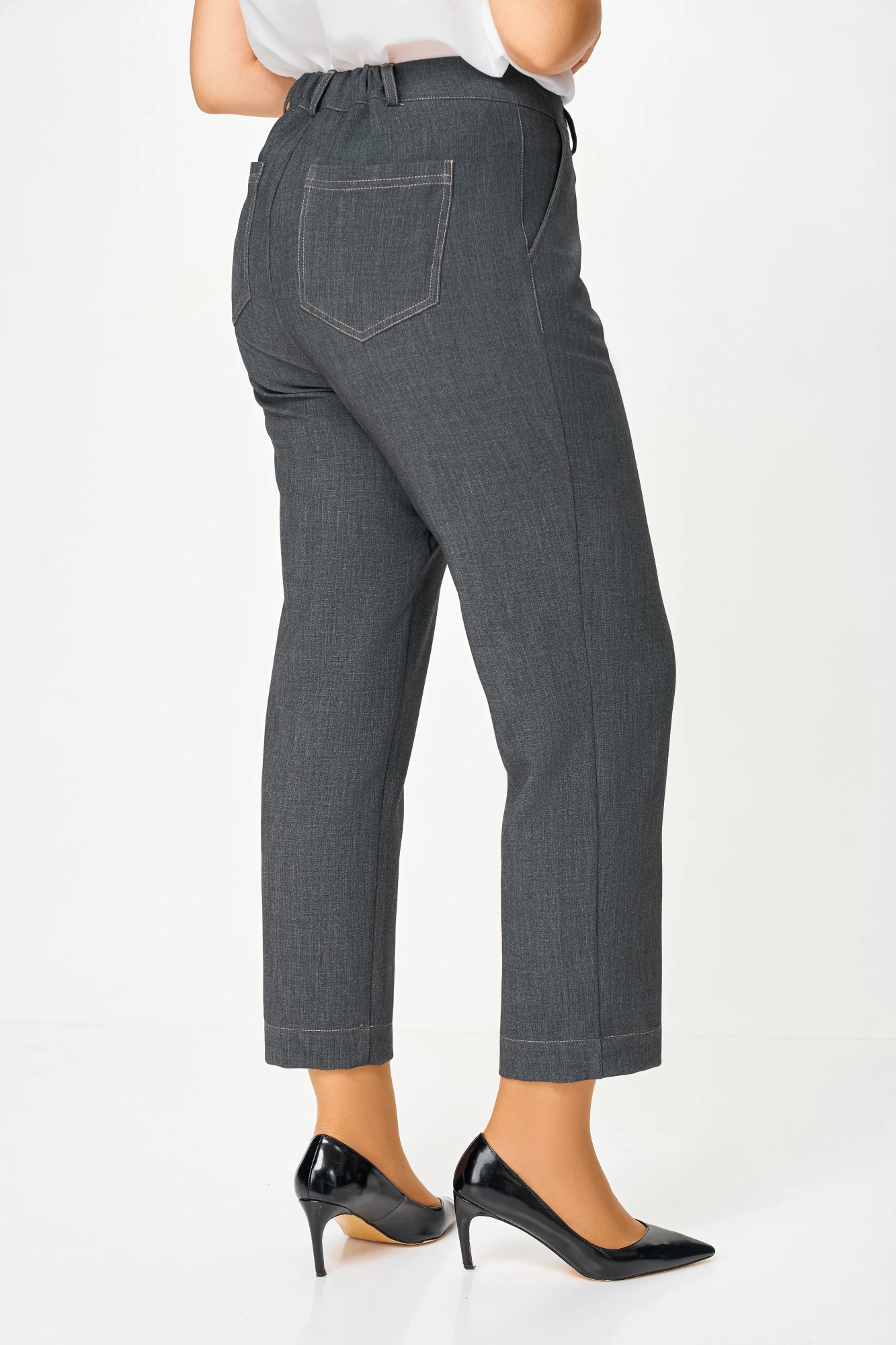 Брюки из мягкой эластичной ткани под джинс, прямого силуэта, заужены к низу. Спереди боковые функциональные карманы, сзади накладные фигурные карманы с двойной контрастной отстрочкой. Пояс притачной с эластичной тесьмой-резинкой по спинке и шлёвками для пояса. Застёжка на тесьму-молнию, петлю и джинсовую пуговицу на поясе.
