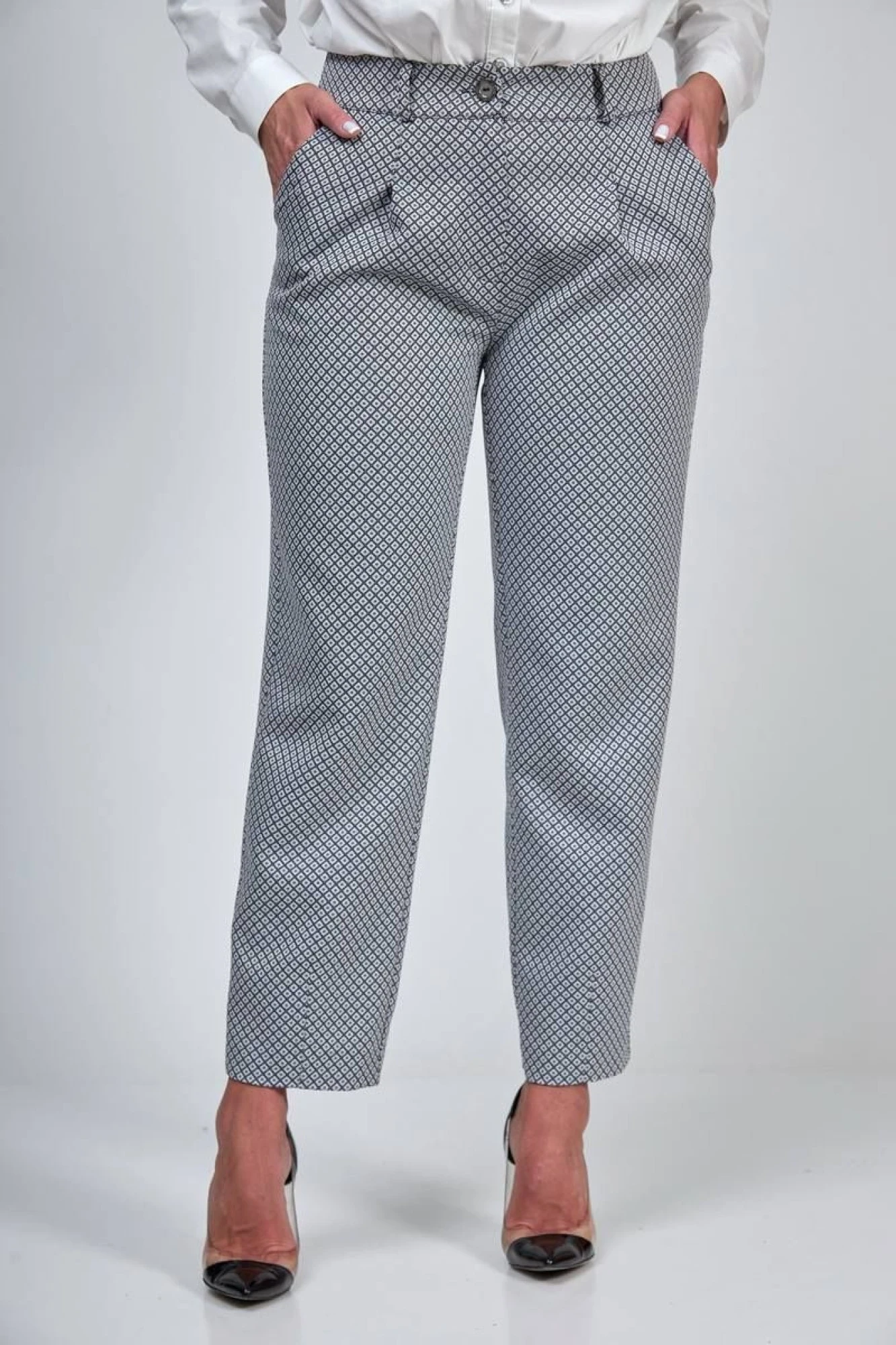 Брюки женские, типа "бананы", чуть укороченные. По переду, от пояса две мягкие складки, частично застроченные и наклонные функциональные карманы. Застежка спереди на тесьму "молния" под "гульфик". Пояс подрезной со шлевками и застежкой спереди на петлю и пуговицу. Сзади накладнфе карманы с декоративной нашивкой. По низу брюк , по центру, спереди и сзади вытачка, создающая объем внизу.