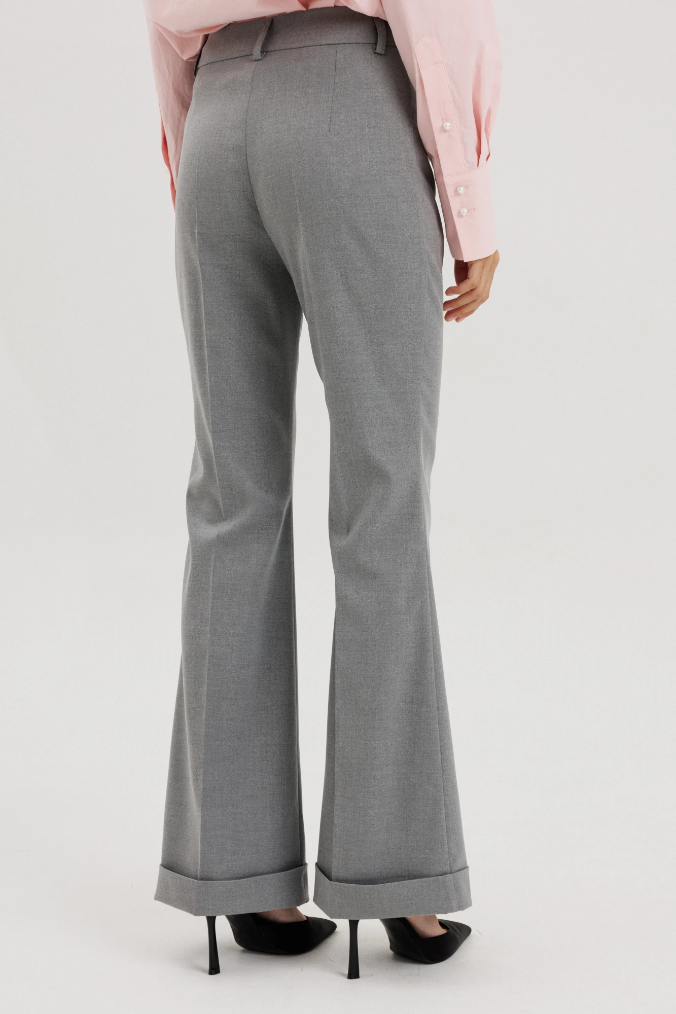 "Расклешенные брюки полупрелегающего силуэта, с цельнокроеной манжетой по низу, посадка высокая , пояс притачной со шлевками, застежка на молнию и петлю-пуговицу, брюки без карманов. .Брюки в ыполнены из премиальной ткани костюмной группы серого цвета.
