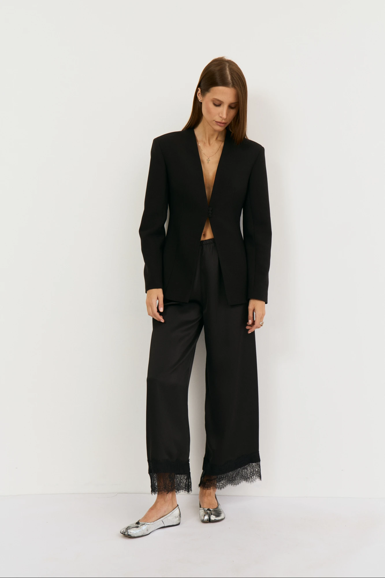 Прямые, укороченные брюки свободного кроя из атласной плотной ткани, талия на резинке , по низу отстроченные французским кружевом. Полуобхват талии - 33 см, полуобхват бедер - 50 см, длина по боковому шву с кружевом 90см.