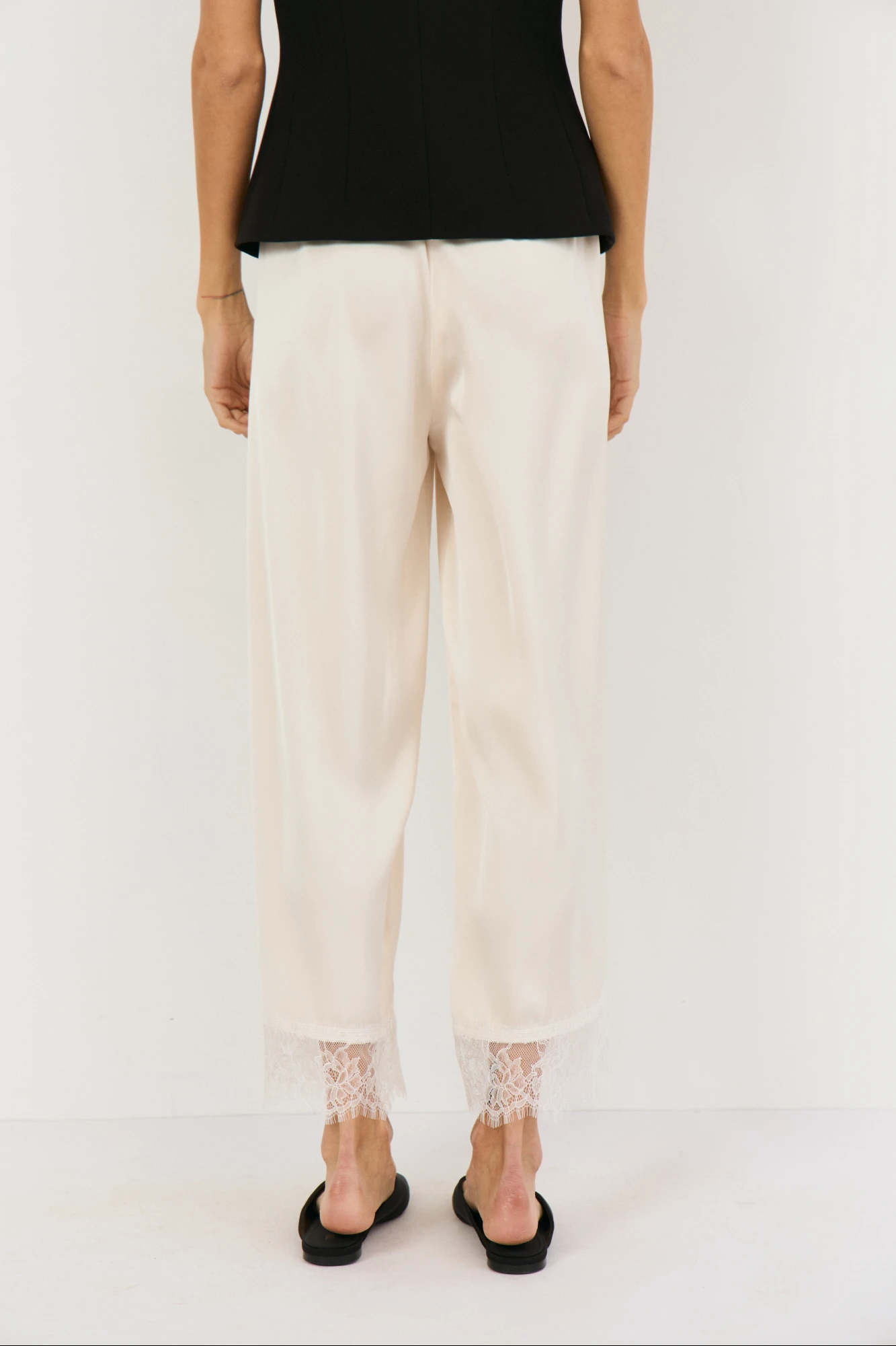 Прямые, укороченные брюки свободного кроя из атласной плотной ткани, талия на резинке , по низу отстроченные французским кружевом. Полуобхват талии - 33 см, полуобхват бедер - 50 см, длина по боковому шву с кружевом 90см.