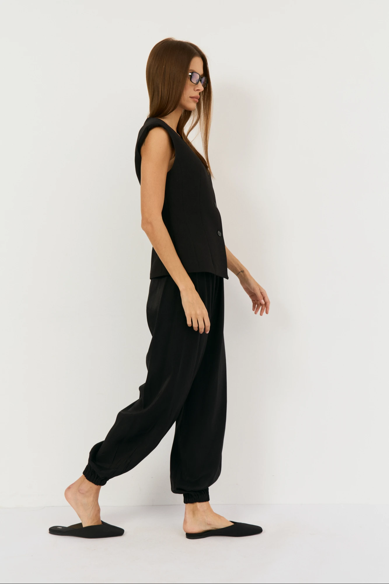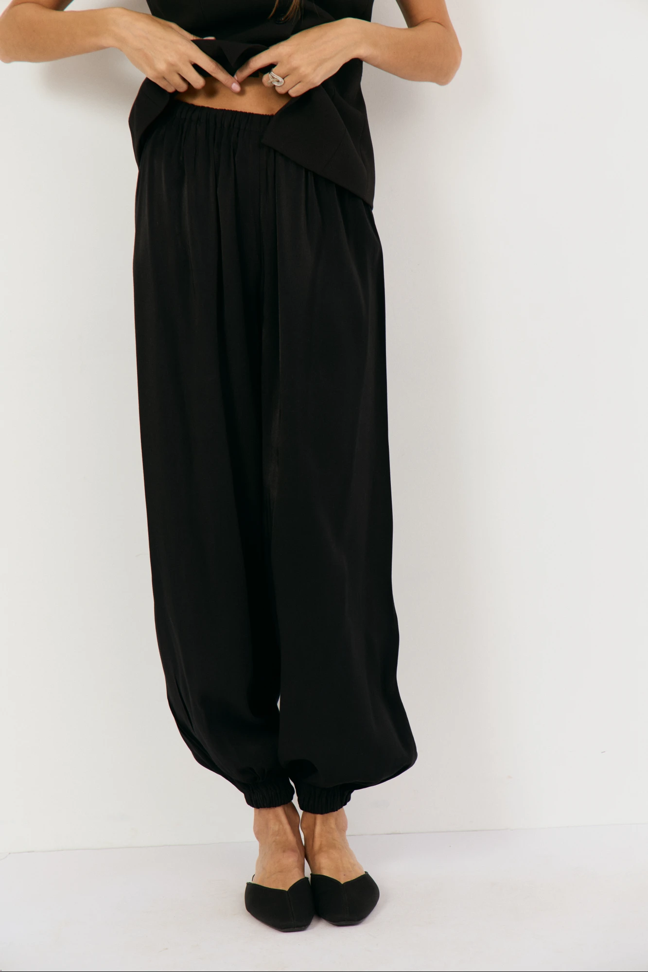Брюки-алладины свободного кроя выполнены из черной вискозы с блеском , талия на резинке, по низу на резинке, что позволяет регулировать высоту брючины. Подойдет на праздник, на повседневный вариант, брюки можно носить с топом, рубашками, блузами. Обувь может быть абсолютно любая: спортивная, вьетнамки, классические туфли, босоножки. Длина изделия по боковому шву с манжетой - 104 см.