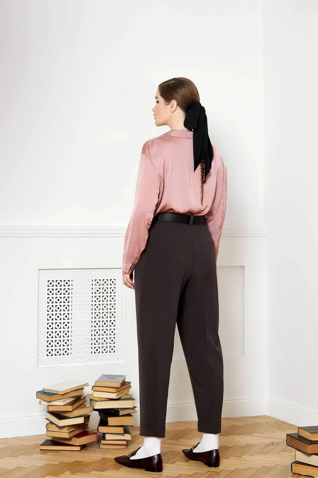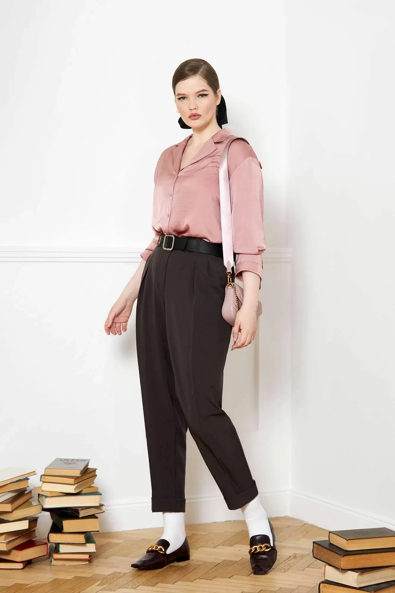Брюки женские, зауженные к низу. Из брючной поливискозы, различных расцветок. Изделие на притачном поясе с шлевками, в который вставлена эластичная тесьма. На передних половинках расположены боковые карманы. На задних половинках вытачки. Длина изделия 7/8.