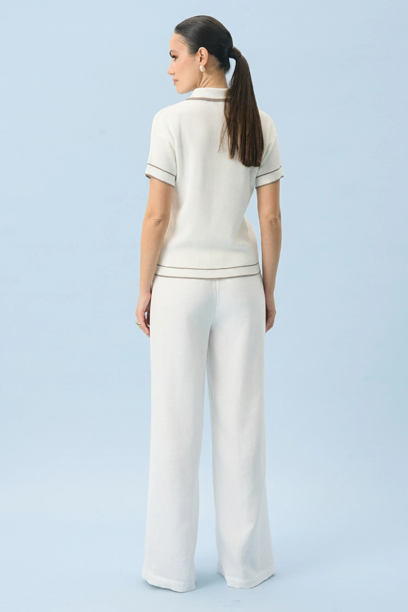Длина по боковому шву с поясом - 110,0 см (±2,0 см), Ширина на уровне линии талии - 39,0 см (±1,0 см), Ширина на уровне линии бедер - 57,0 см (±1,0 см), Ширина брюк по низу - 33,0 см (±1,0 см), Ширина пояса - 4,7 см.