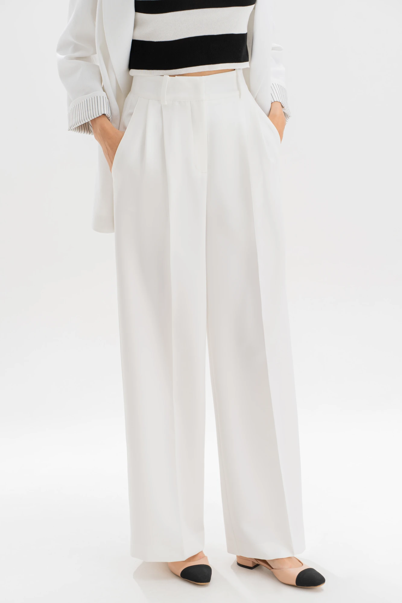 Идеальные белые брюки — основа капсульного гардероба. Модель выполнена в прямом крое, визуально вытягивающем силуэт и придающем образу легкость. Аккуратные стрелки, лаконичные складки от пояса и деликатные вытачки формируют безупречную посадку. Пояс с регулируемыми патами обеспечивает комфортную посадку на талии, а универсальный цвет легко сочетается как с базовыми топами, так и с яркими акцентами. Брюки женские, прямые, выполнены из костюмно-плательной ткани ""барби"". Передние и частично задние половинки брюк, с отрезным поясом, задние половинки брюк от вытачки до бокового шва с цельнокроеным поясом, с застёжкой на тесьму - «молнию», расположенную в среднем шве передних половинок, Пояс застегивается спереди на один пришивной крючок и 1 петлю и 1 потайную пуговицу. Для регулировки пояса по талии в боковых швах обработаны паты, застегивающиеся на 1 петлю и 2 пуговицы. Передние половинки брюк с боковыми наклонными карманами, частично застроченными от пояса вниз на 3,0 см, с двумя парами односторонних складок от пояса, с 2-мя шлевками. Задние половинки брюк с талиевыми вытачками. Передние и задние половинки брюк с заутюженными стрелками. Состав ткани: полиэстер - 80%, вискоза - 11%, спандекс - 9%.