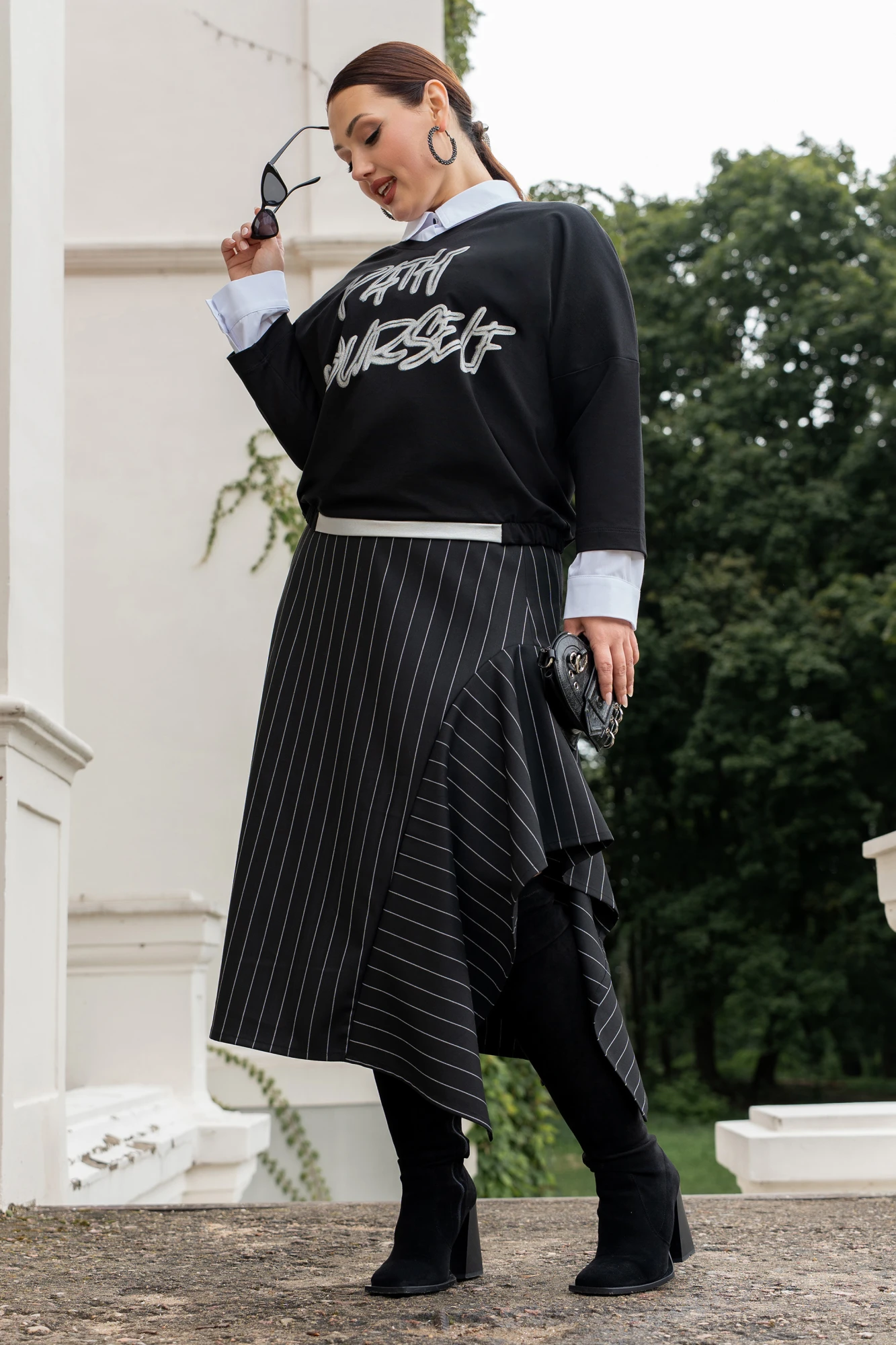 Джемпер выполнен из премиум трикотажа, свободного силуэта,с V-образным вырезом горловины, со спущеным плечом, рукава 7/8. По полочке серебрянная дизайнерская печать, по низу серебрянная вставка. Спинка со средним швом. Горловина обработана бейкой. по низу спинки и бокам с эластичной резинкой.