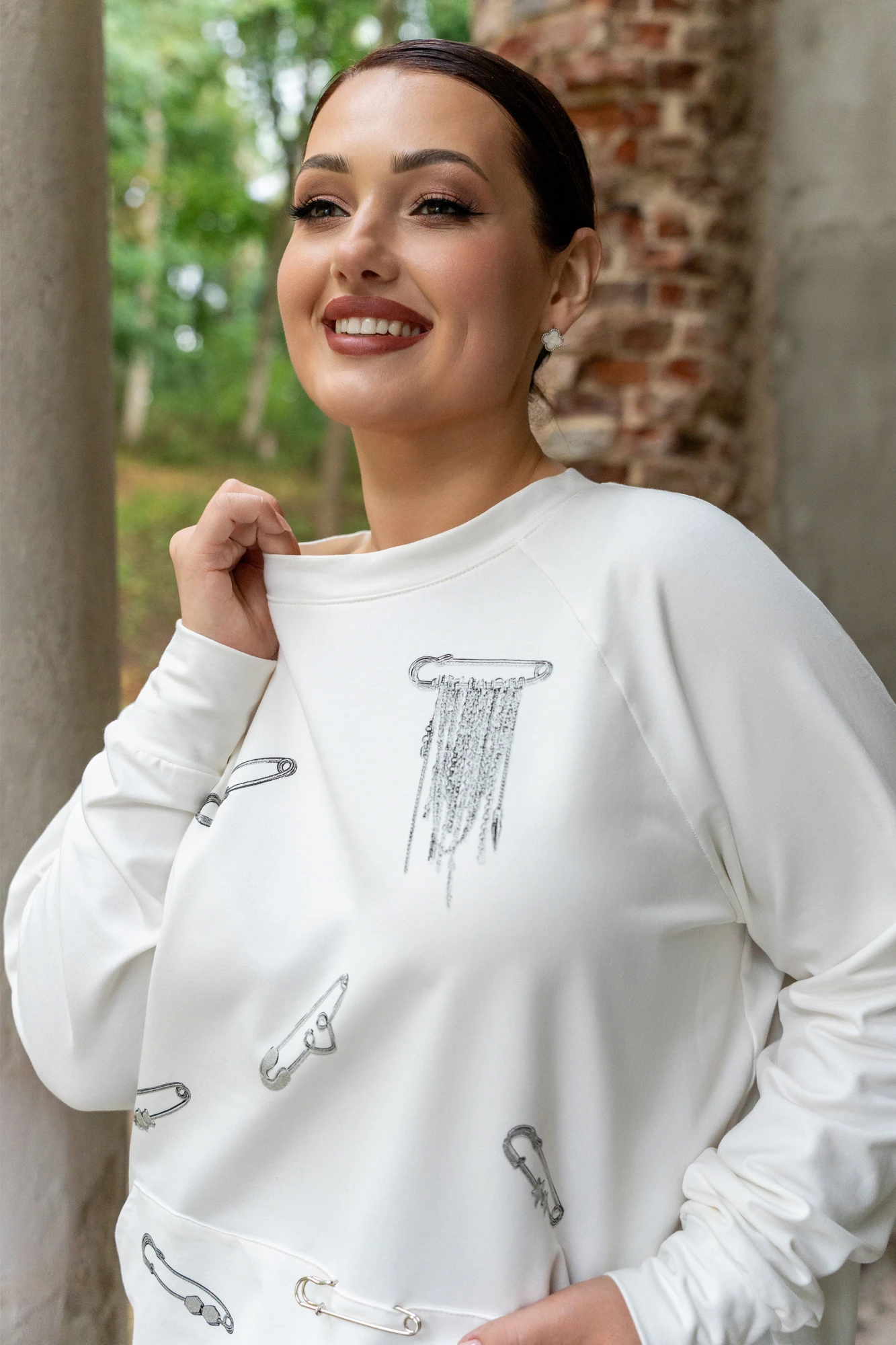 Джемпер прямого кроя с дизайнерской печатью"булавки", полочка с накладным карманом.Джемпер с притачными рукавами и манжетами.