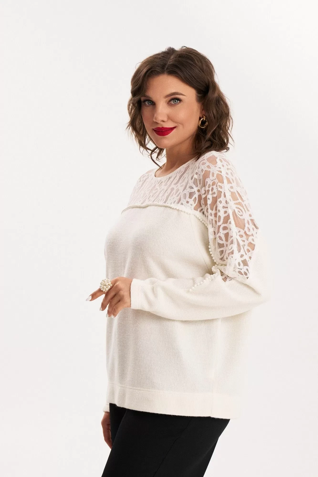Модный, свободный джемпер выполнен из 2-х видов ткани, гипюра и трикотажа в рубчик. Рукав цельнокроенный, длинный. По переду и спинке кокетки. Застежка по спинкена нависную петлю. Отделкой служит декоративная тесьма с жемчугом по шву притачивания кокетки полочки. Нежный, удобный джемпер станет идеальным базовым предметом гардероба.