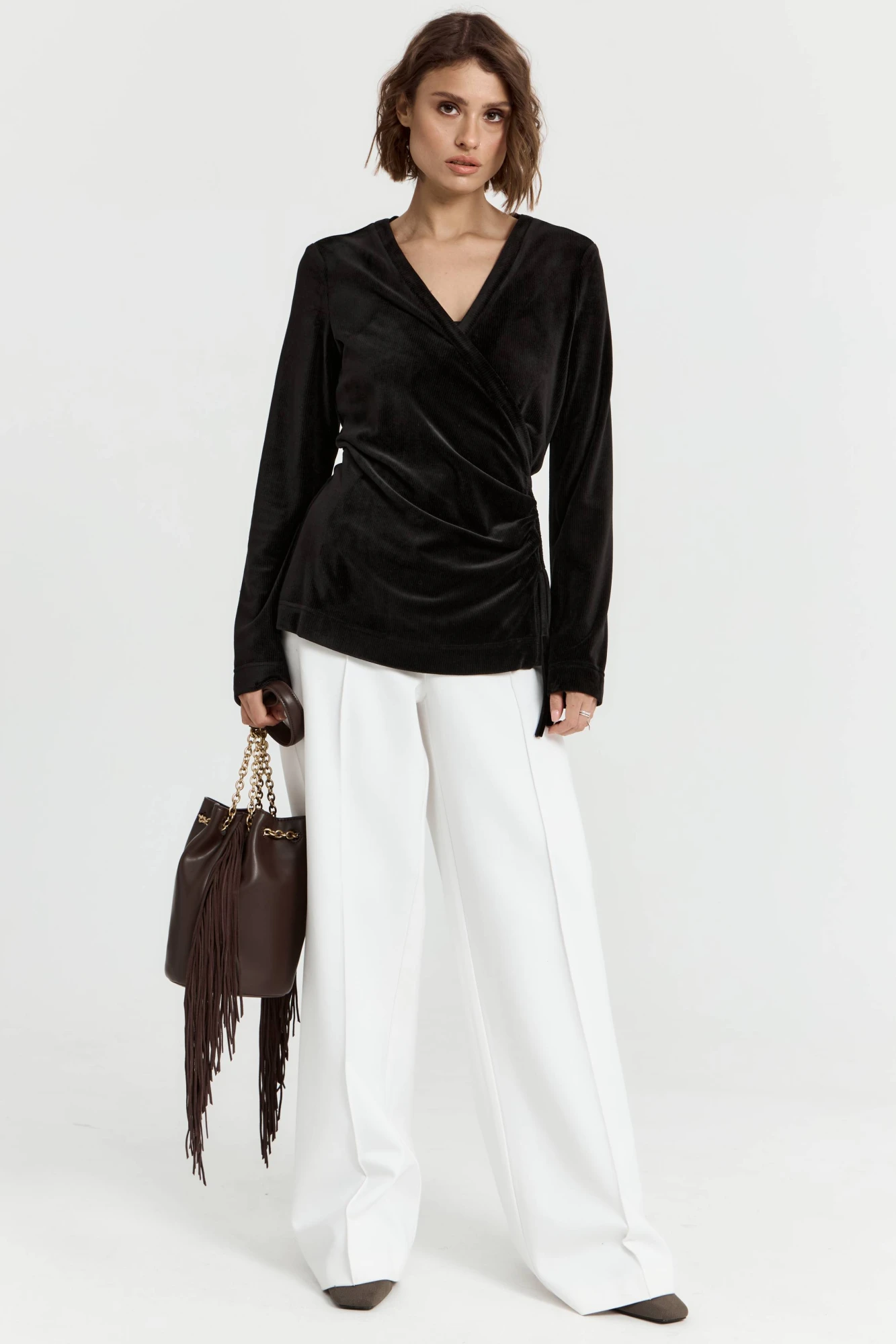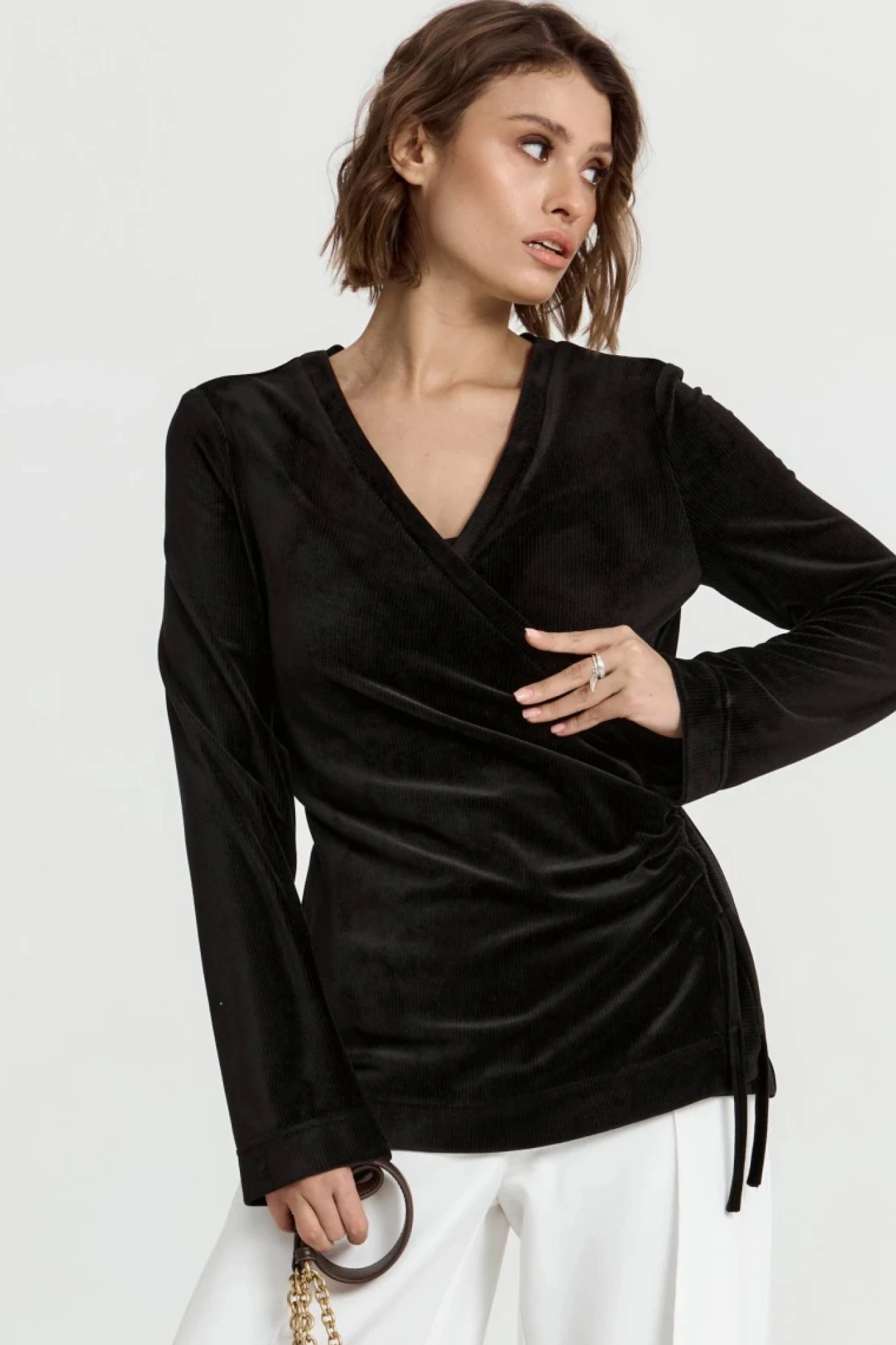 Джемпер из трикотажной ткани, выполнен из ткани с эффектом бархата, в черном цвете. Джемпер с v-образной горловиной, на запах, драпировка по переду сбоку изделия.