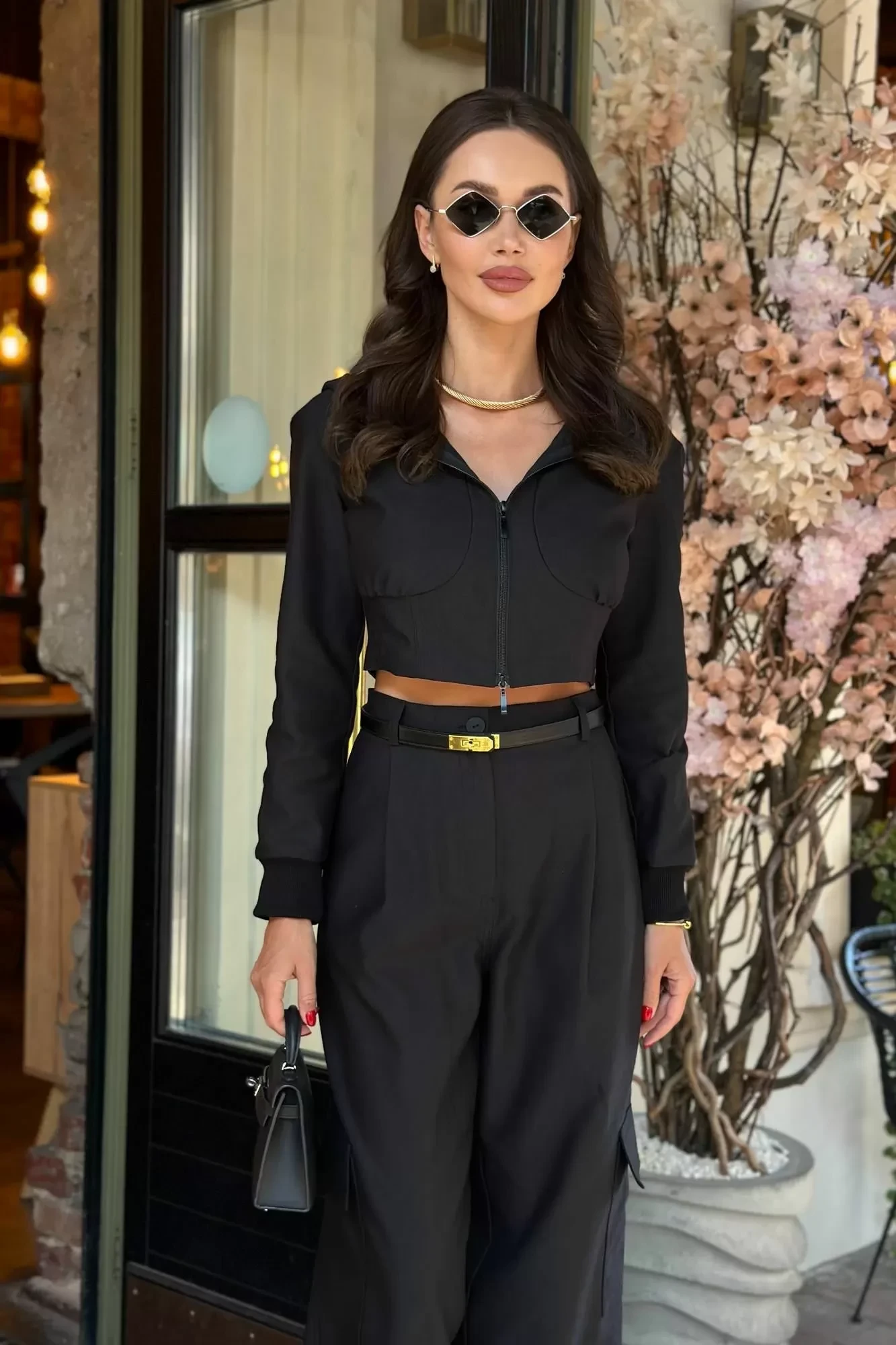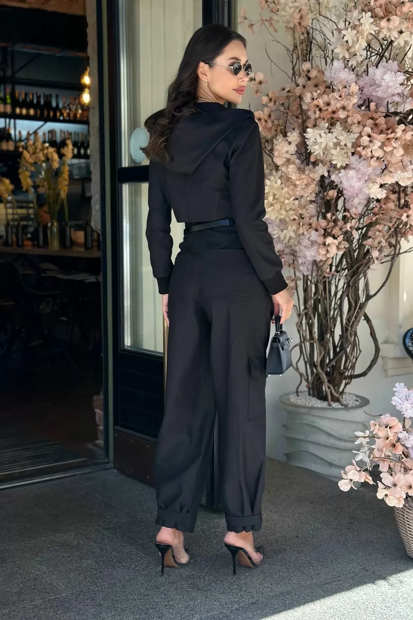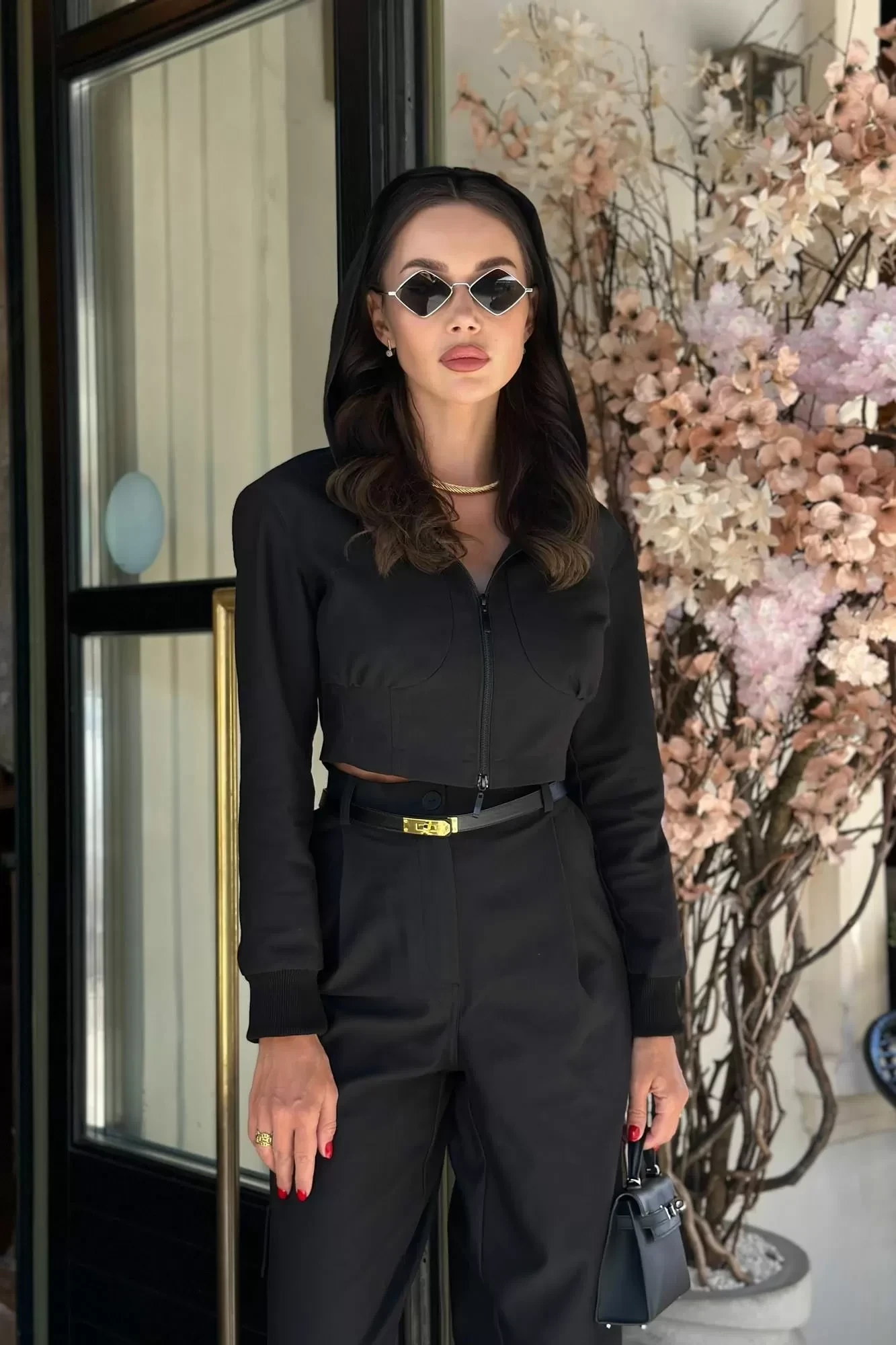 Джемпер из неэластичного денима. Застёжка - разъёмная молния по центру переда. Джемпер обработан капюшоном, манжеты обработаны вставкой из трикотажной эластичной резинки. Лиф в области талии застрочен для приталенного силуэта, область груди оформлена сборкой с имитацией чашек бельевых.