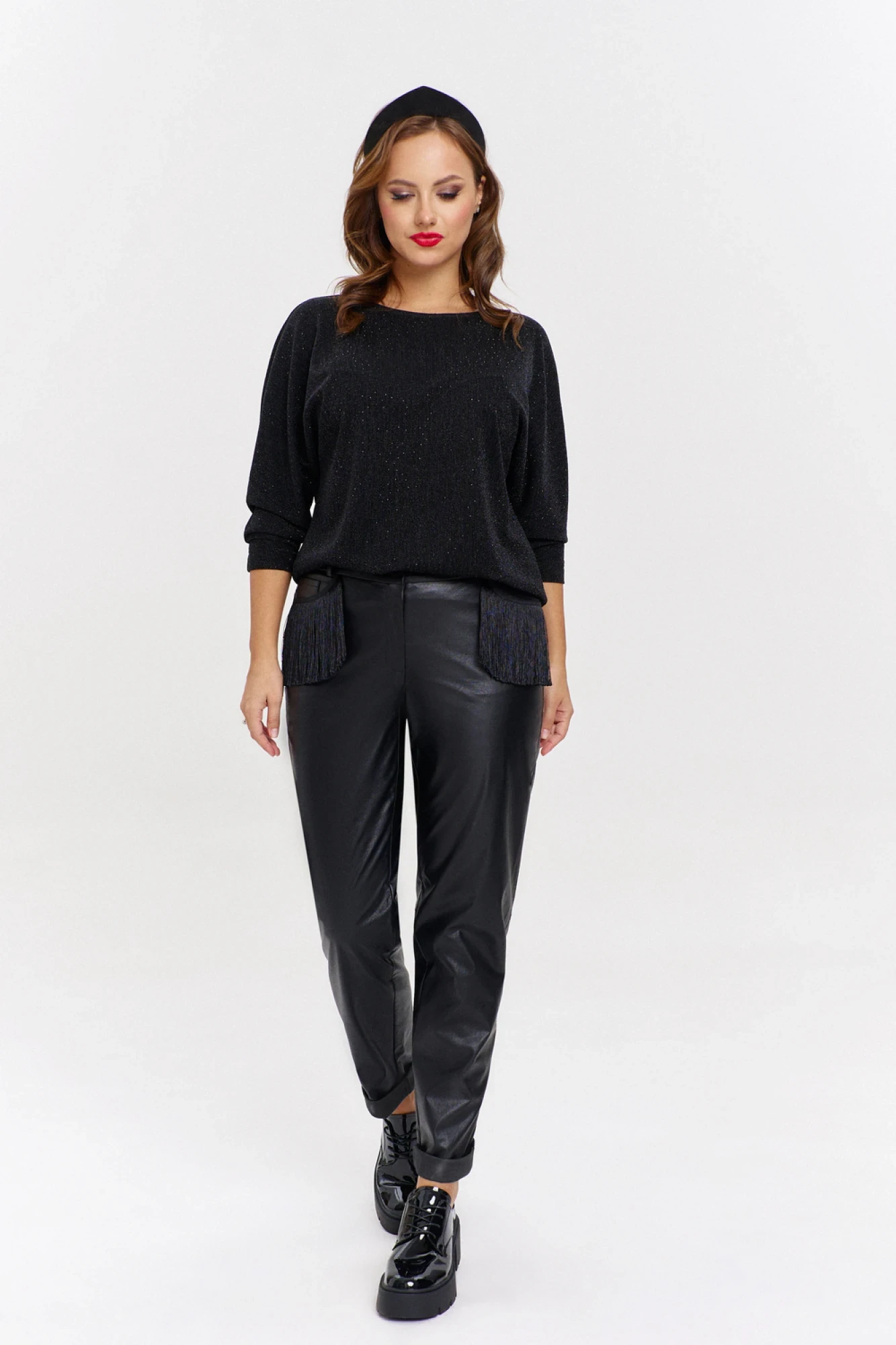 Джемпер из мягкого эластичного трикотажа с черным люрексом и стразами, придающими изделию мерцающий блеск, свободного силуэта, с цельнокроеным рукавом длиной 3/4. Вырез горловины круглый. На спинке V-образная вставка из полупрозрачной сетки, декорированная авторской аппликацией из страз.