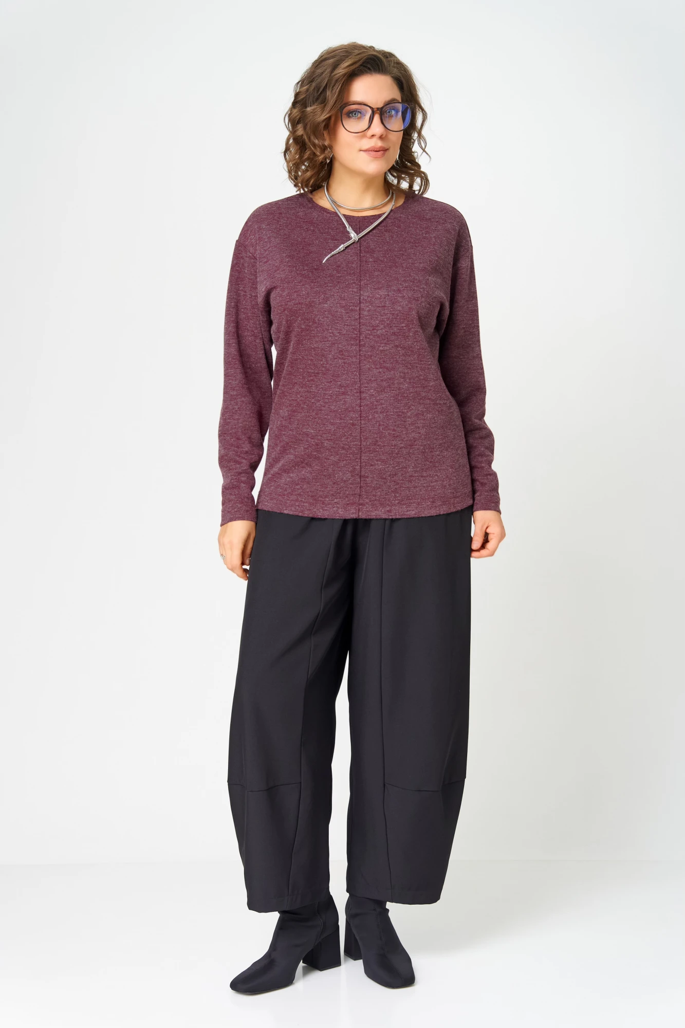 Джемпер имеет округлую горловину, которая создает стильный