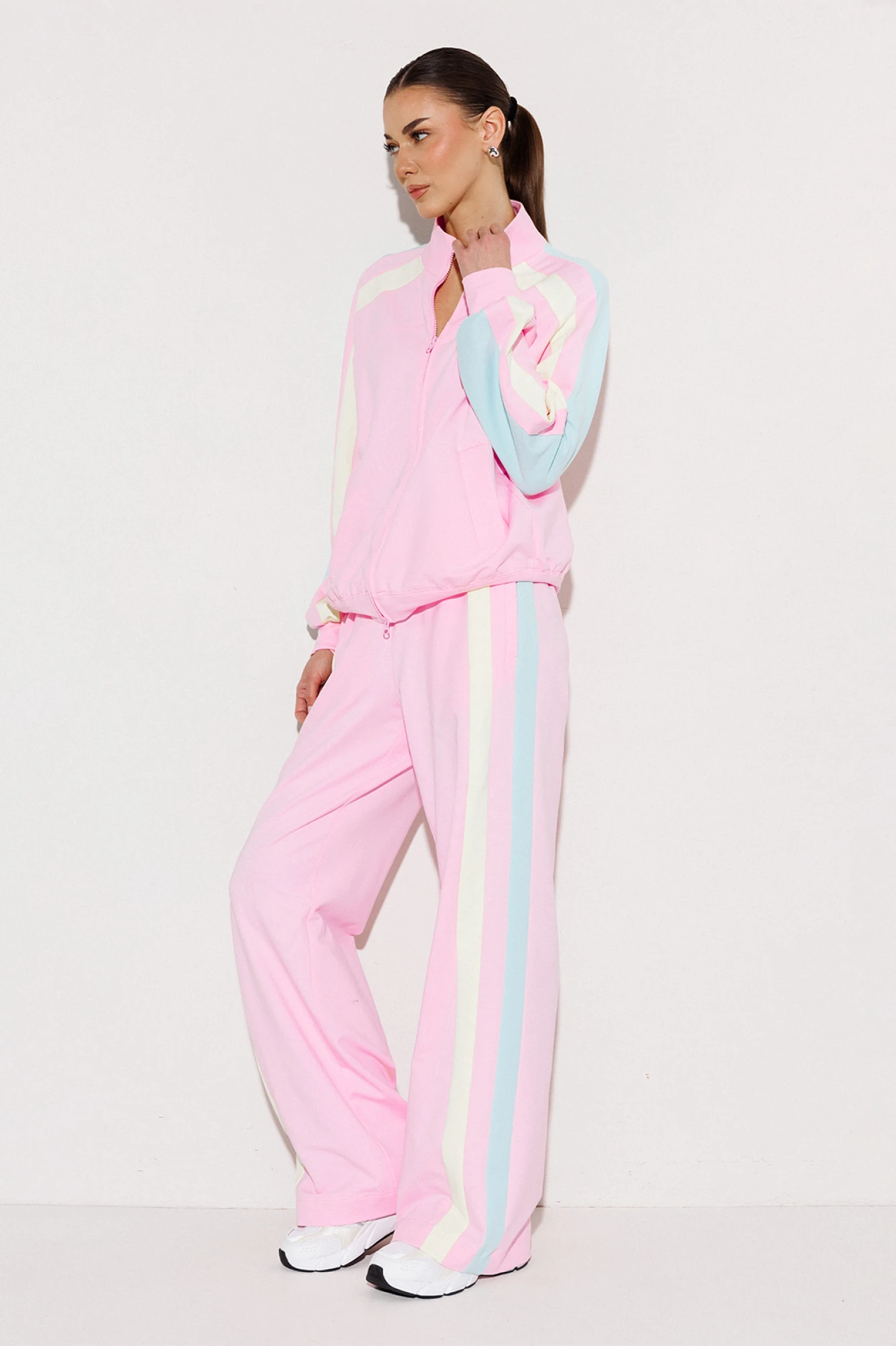 Джемпер мультиколор из технологичного трикотажного полотна с эффектом peach прямого силуэта. По полочке рукав-реглан, по спинке-втачной. Рукав с лампасами из ткани другого цвета с манжетой по низу рукава. Полочка с центральной застежкой на тесьму-молнию, карманом-листочкой и печатью "Cherry". По переду рукав переходит в кокетку. По спинке один из лампасов переходит в кокетку. По горловине воротник-стойка. По низу изделия притачная планка.