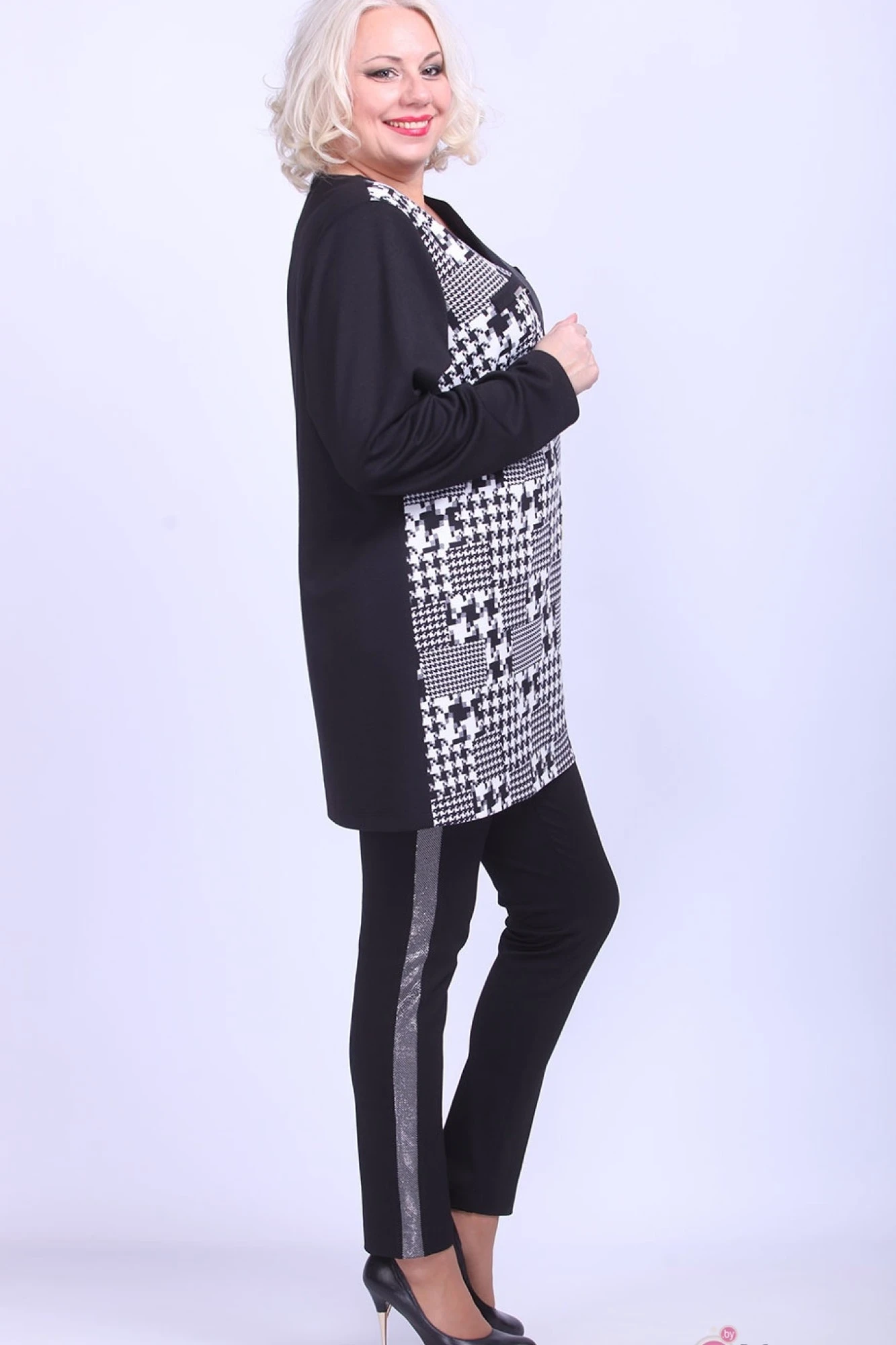 Удлиненный джемпер прямого силуэта с асимметричным расположением полотен разных фактур. Горловина блузки округлой формы, переходящая в декоративную планку. Рукав длинный, втачной. В сочетании с брюками джемпер прекрасно подойдет и для работы в офисе, и для повседневных занятий.