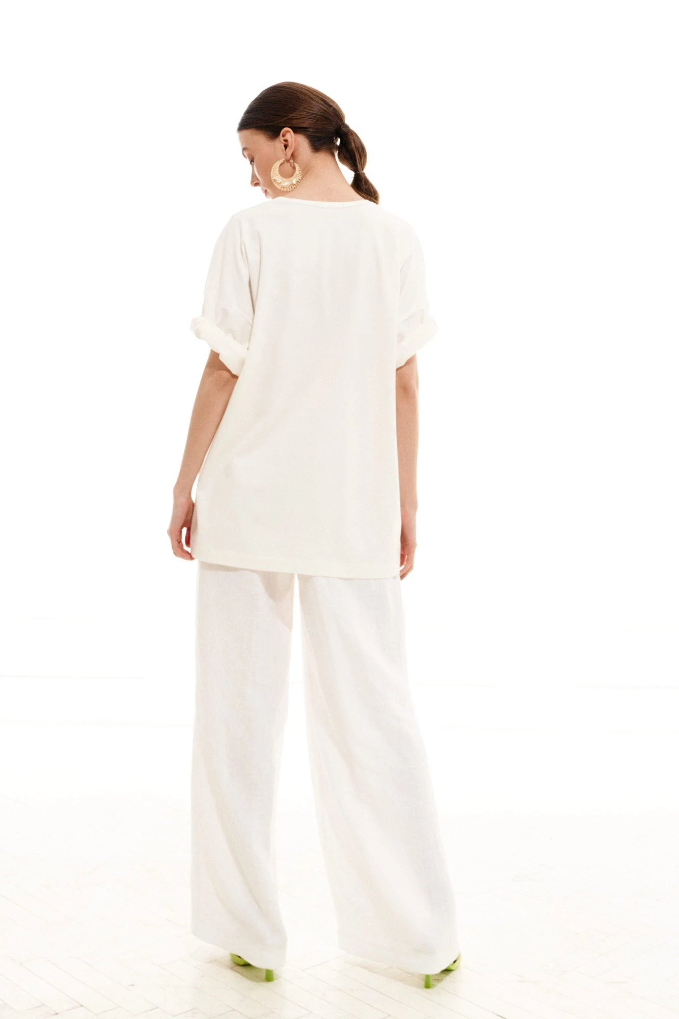Джемпер женский, свободного силуэта, длиной до середины линии бедер из трикотажного полотна, со спущенной линией плеча. Перед с декоративной вышивкой из пайеток. Рукав одношовный, длиной выше линии локтя. Вырез горловины круглый.