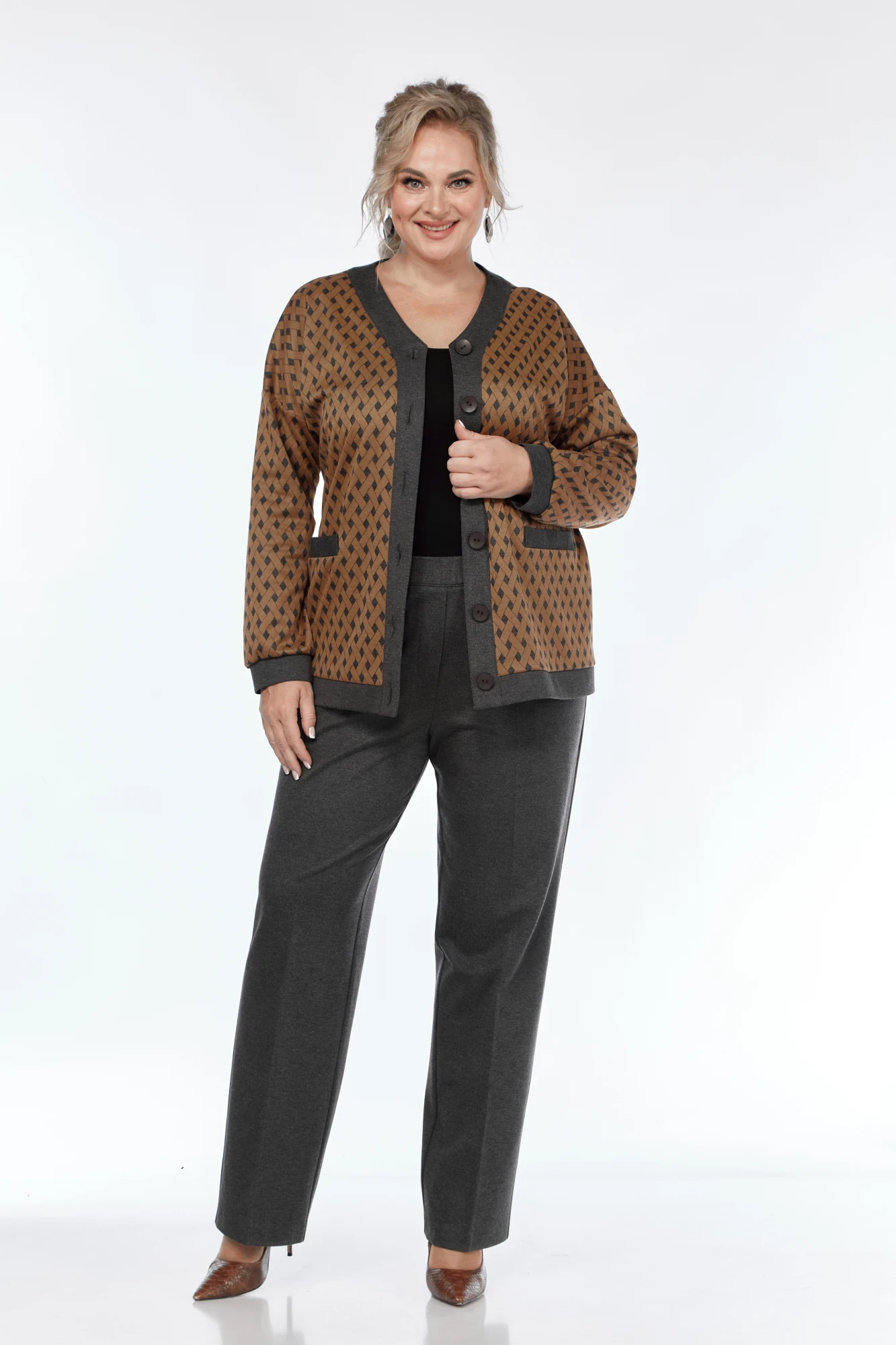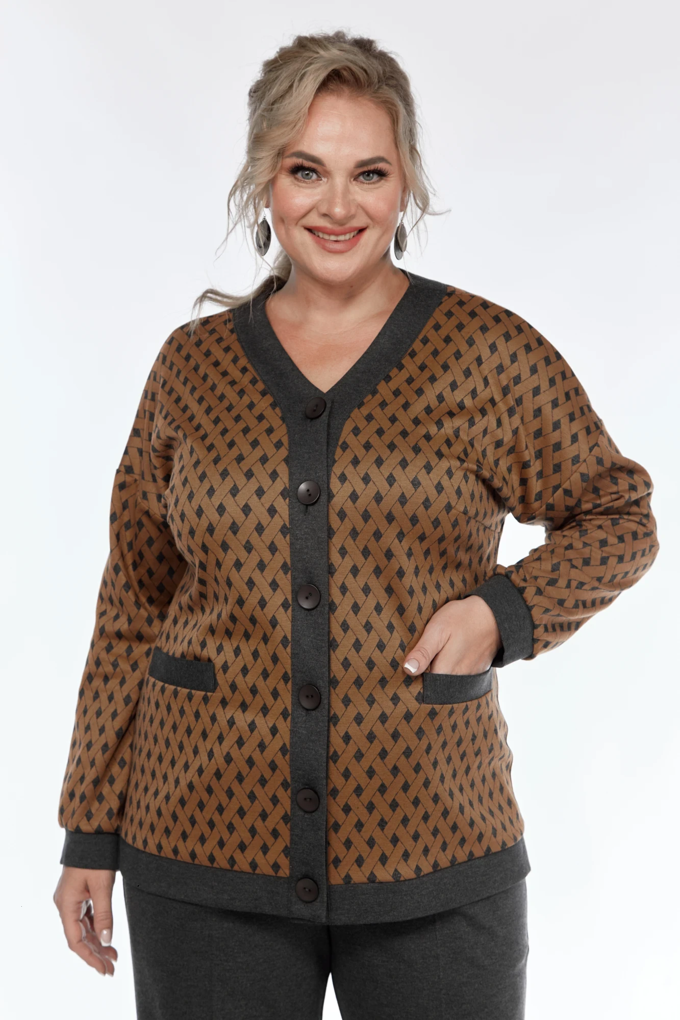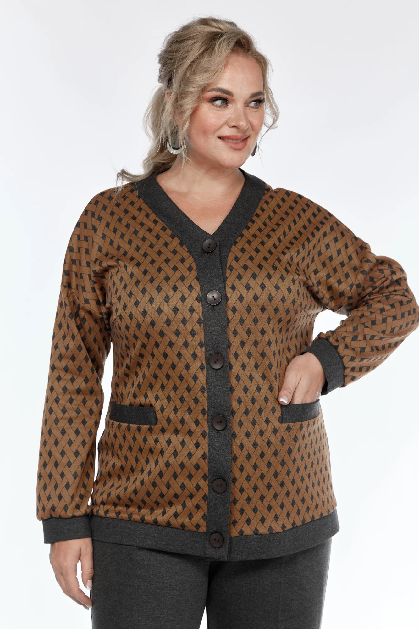 Очень удобный, практичный джемпер из принтованного трикотажного полотна полуприлегающего силуэта. На полочке нагрудные вытачки. V-образная горловина, застежка по центру в виде планки на петли и пуговицы. Карманы прорезные с настрочными листочками. Линия плеча спущена, рукав втачной.