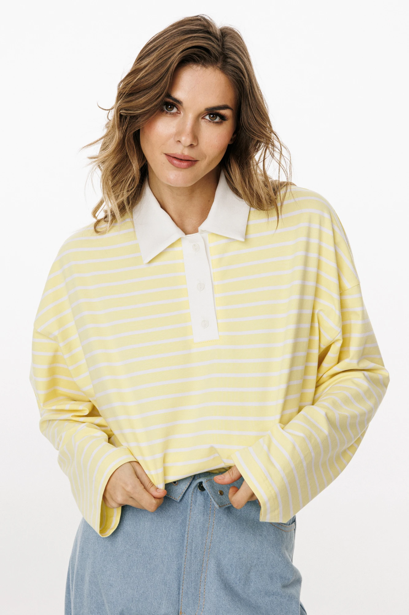 Джемпер выполнен из трикотажного полотна в полоску. Джемпер прямого силуэта, покроя oversize. Длиной до линии бедер. По переду обработана застежка на планке от горловины до линии груди. Горловина округлой формы, обработана воротником рубашечной формы. Плечевой шов удлинен. Рукав рубашечного покроя, одношовный. Планки и воротник выполнены из однотонного трикотажного полотна.