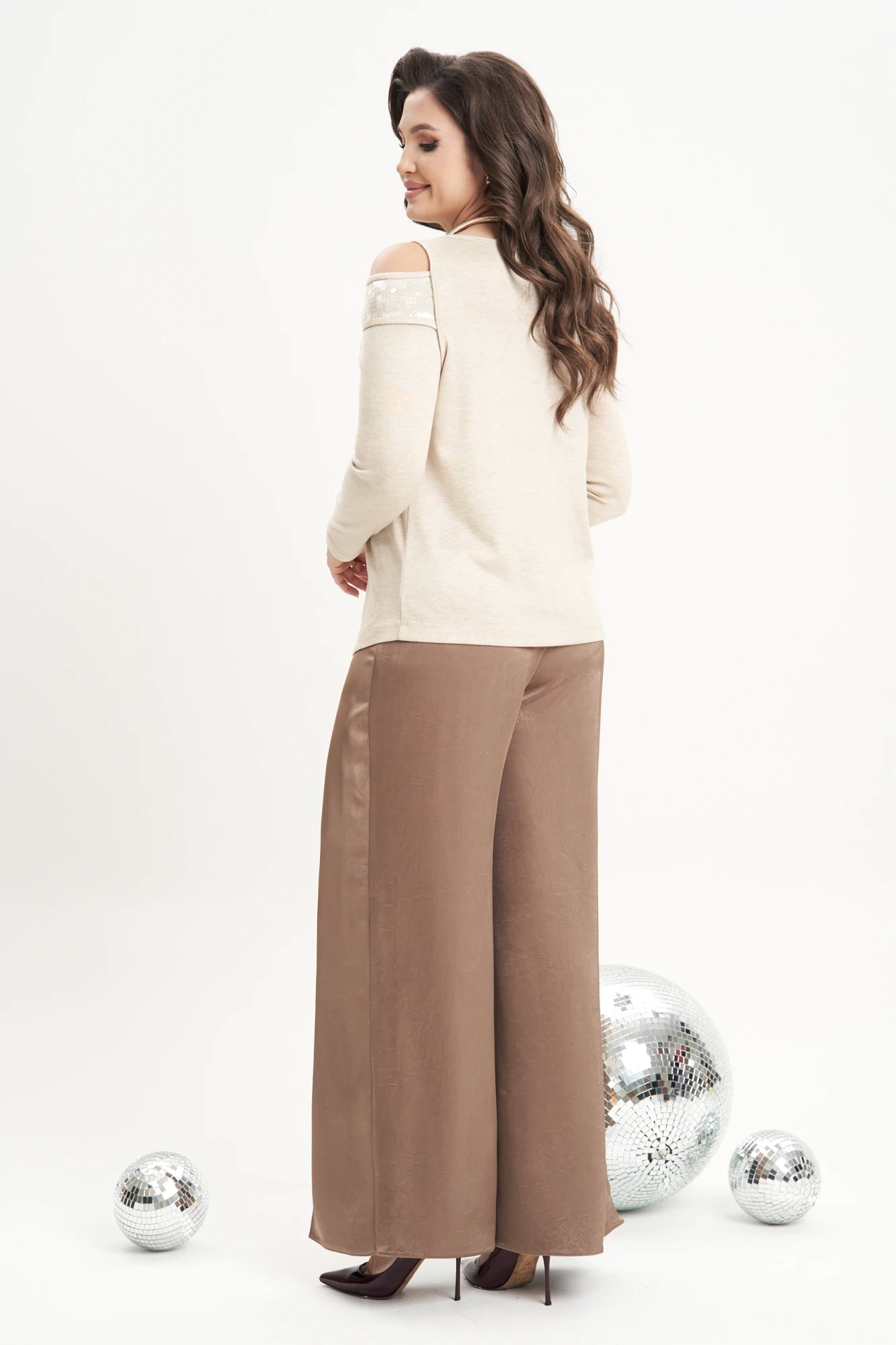Отделочная деталь из крупной пайетки в тон основному полотну придаёт модели особый характер. Силуэт - полуприлегающий, покрой - сложный комбинированный, рукав одношовный длинный.