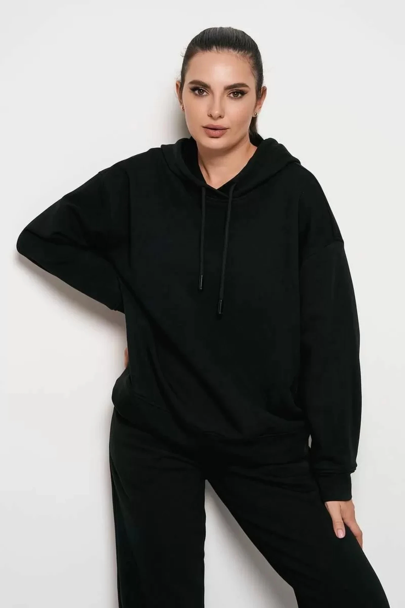 Женский худи с капюшоном свободного силуэта выполнен из высококачественного футера 3-х нитки класса "пенье". Лицевая сторона ткани гладная, изнанка - петлеобразная. Изделие имеет спущенную линию плеча и длинные рукава с углубленной проймой. Низ худи и рукавов выполнены с планками без резинок, в капюшон вставлен декоративный шнур.