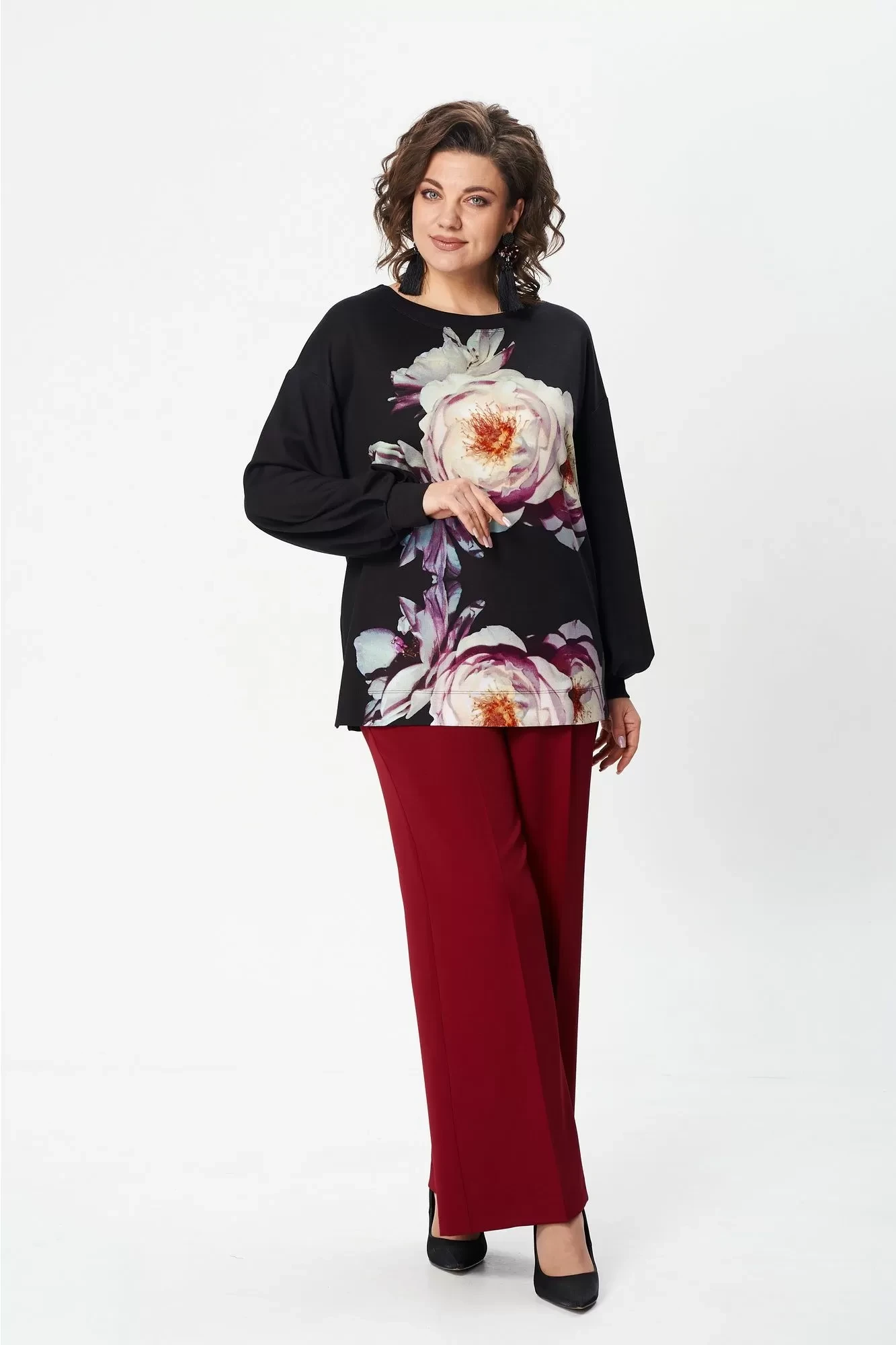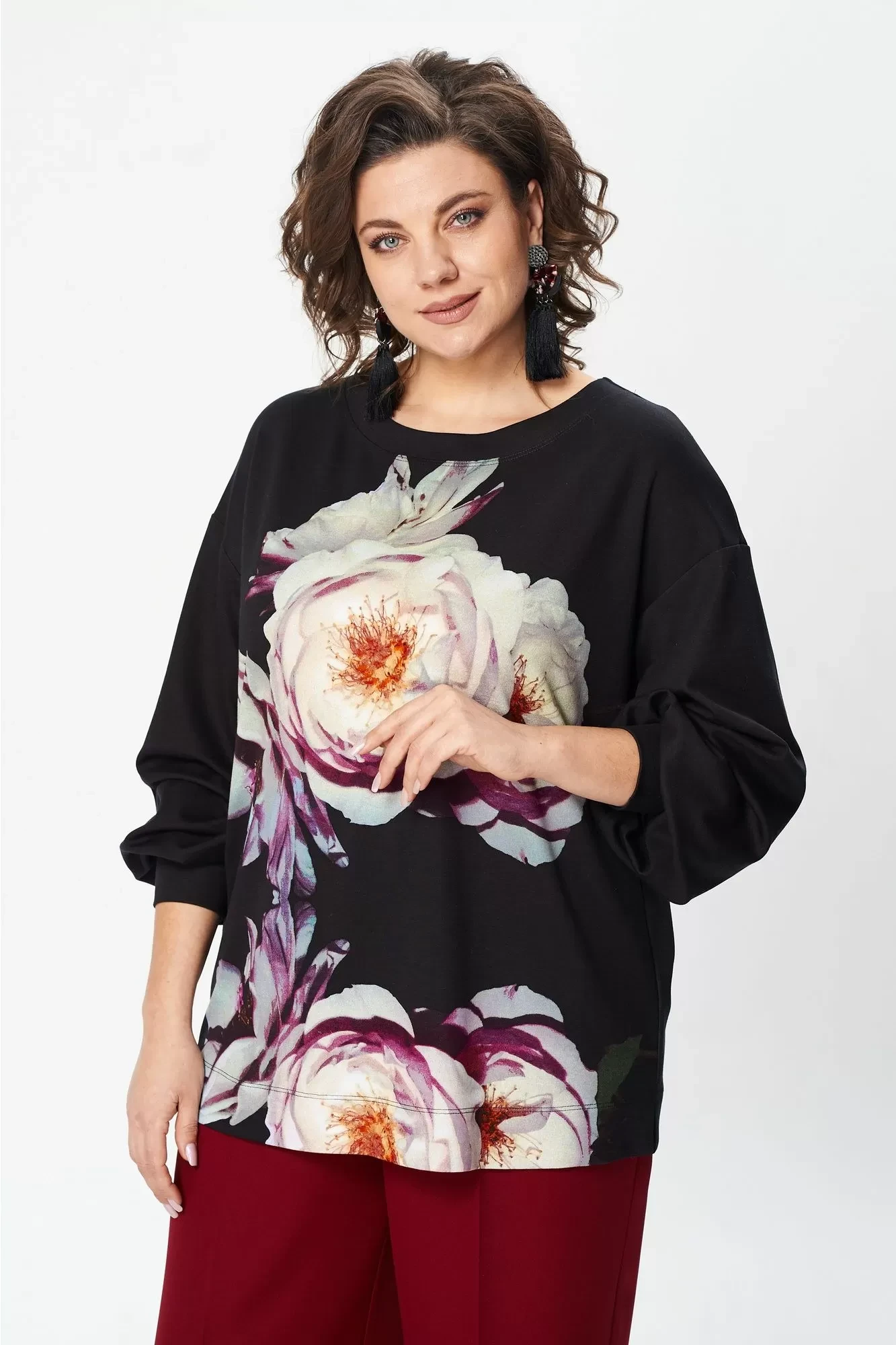 Джемпер свободного силуэта из трикотажной ткани с принтом. Рукав втачной одношовный со складками по низу и манжетой. Горловина лодочкой обработана планкой. В боковых швах по низу разрезики. Длина джемпера - 68 см, длина рукава джемпера - 53 см."