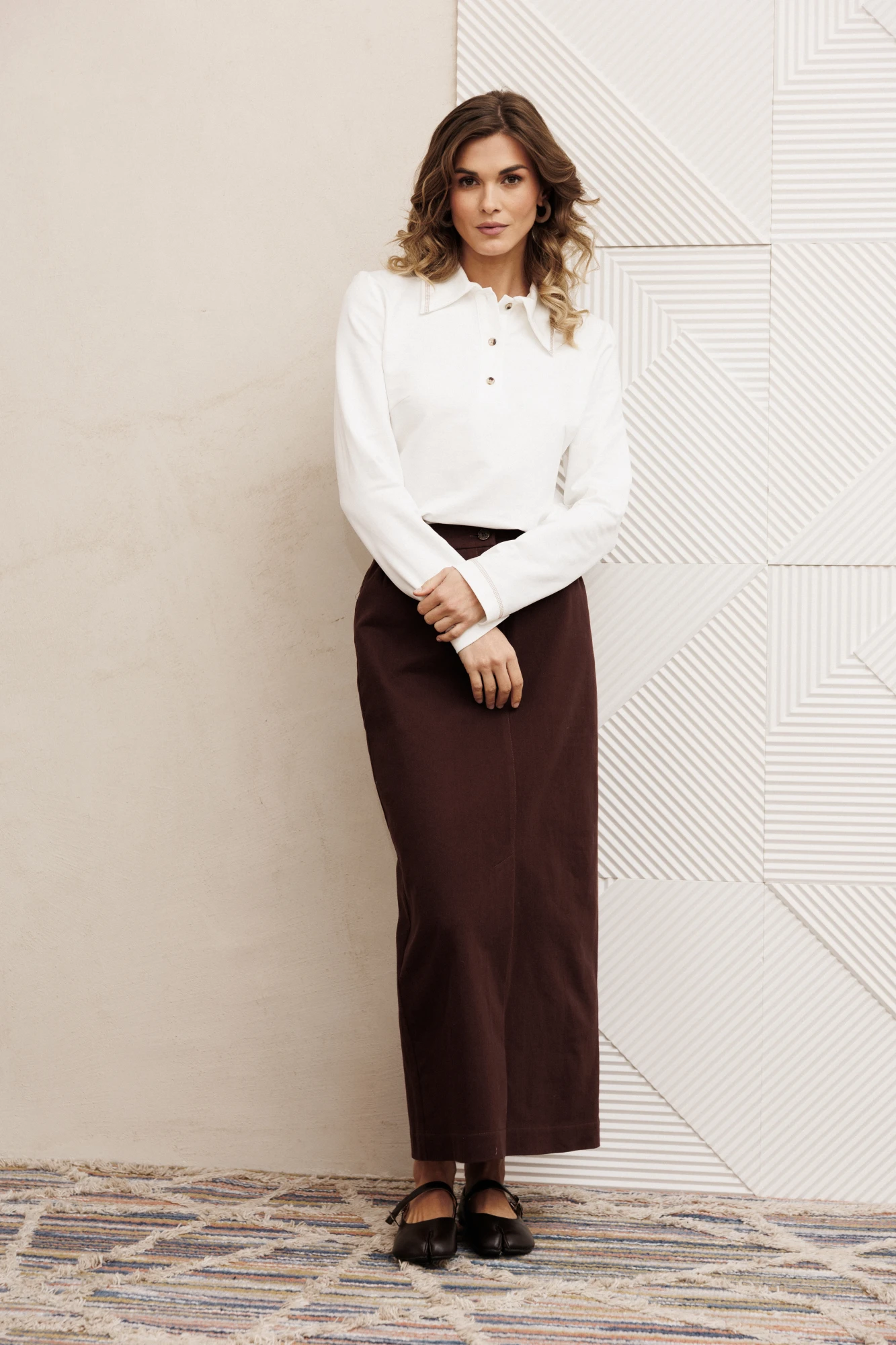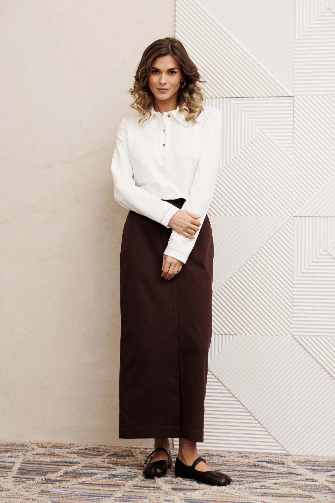 Джемпер прямого силуэта из трикотажного полотна. Перед с застежкой поло и нагрудными вытачками. По воротнику, низу изделия и низу рукава отстрочена декоративная строчка. Длина джемпера - 61 см, длина рукава - 61 см.