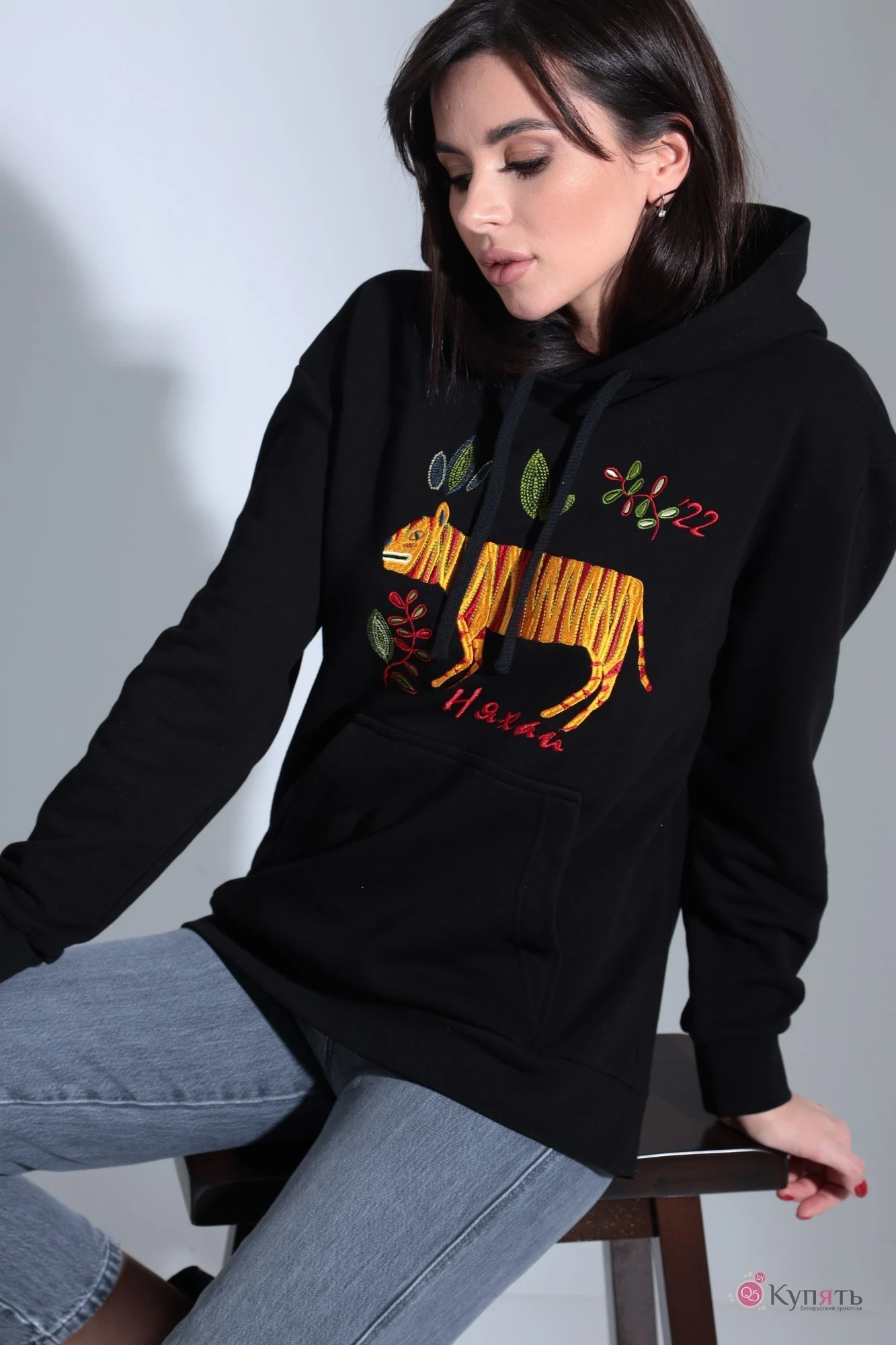 Стильное худи свободного кроя из футера 3-х нитка. Худи с капюшоном имеет приспущенный рукав и настрочной карман-кенгуру, манжеты на довязе. По переду украшен объёмной вышивкой.