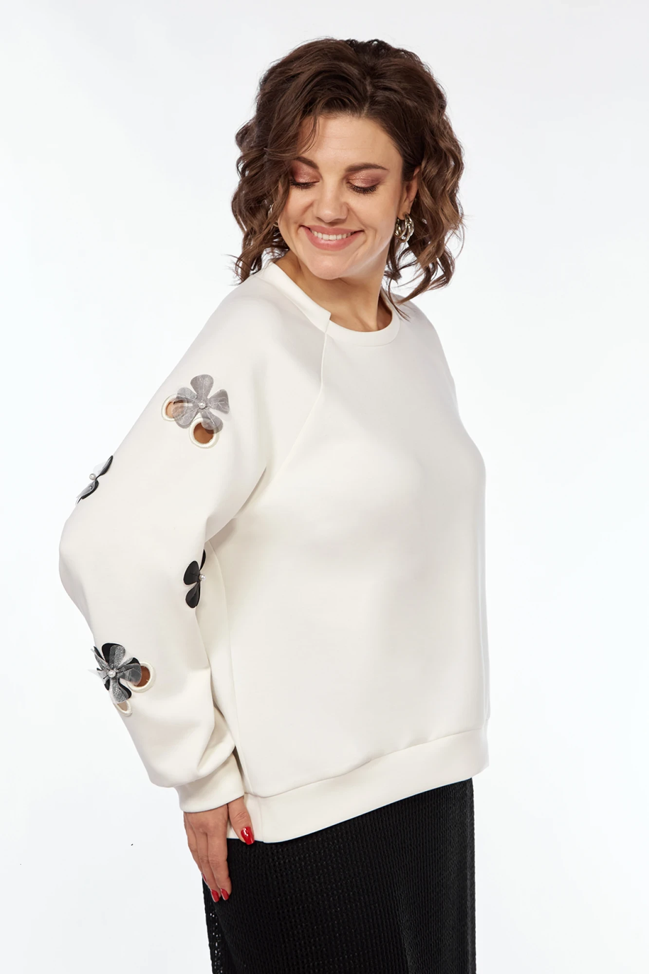Джемпер свободного силуэта выполнен из трикотажного полотна. Горловина фигурной формы. Рукава — реглан, декорированы вышивкой с отлетными цветочками из органзы и искусственной кожи. По низу рукавов манжеты. Джемпер с фигурной линией низа.