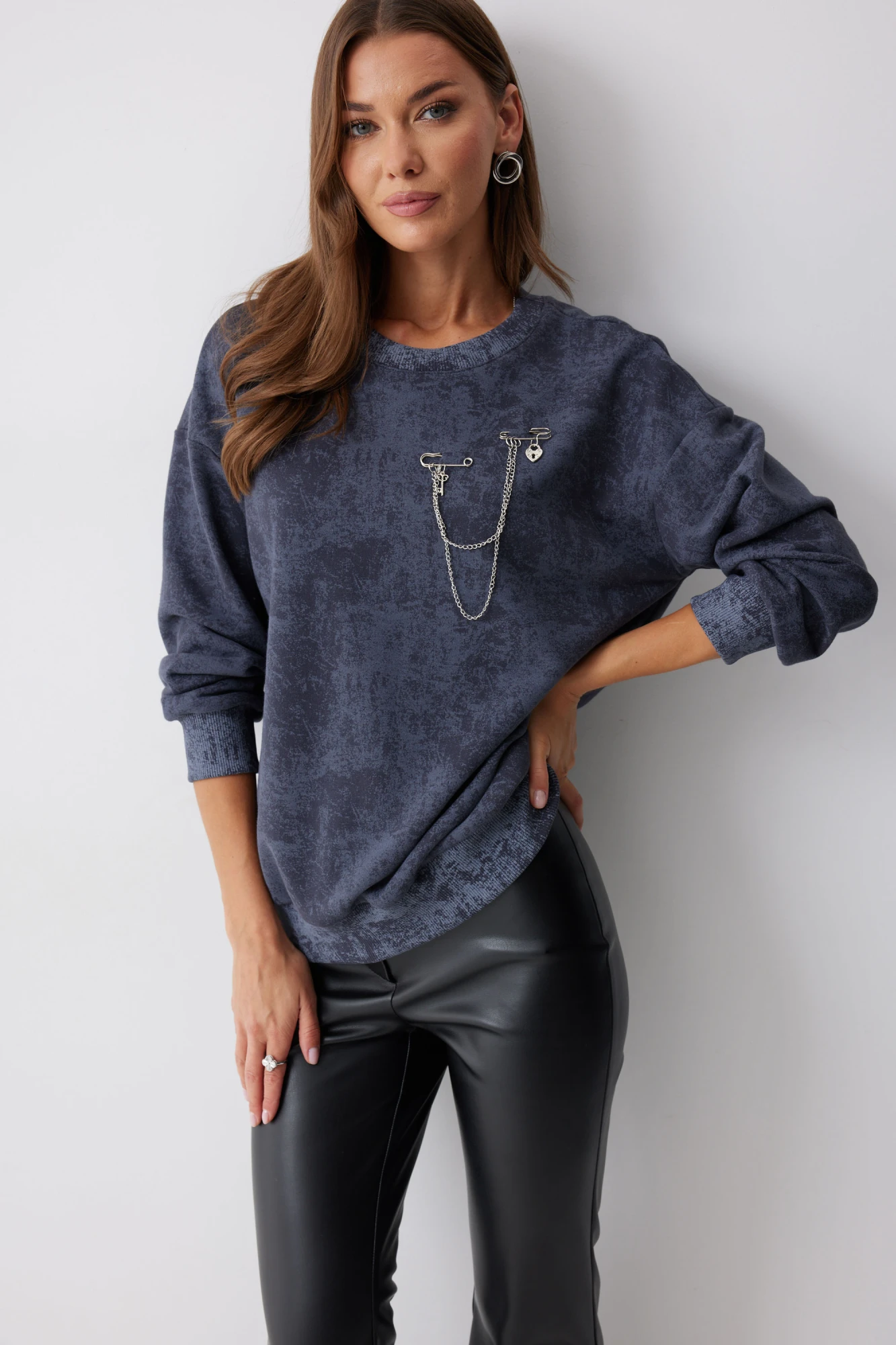 Джемпер прямого силуэта с притачным поясом по низу из трикотажного полотна. Горловина округлая с притачной планкой. Джемпер со спущенным плечом, рукав втачной с притачным манжетом по низу. На спинке расположена дизайнерская вышивка. В комплект входит съёмное украшение. Обращаем ваше внимание, что фурнитура может незначительно отличаться от фото.