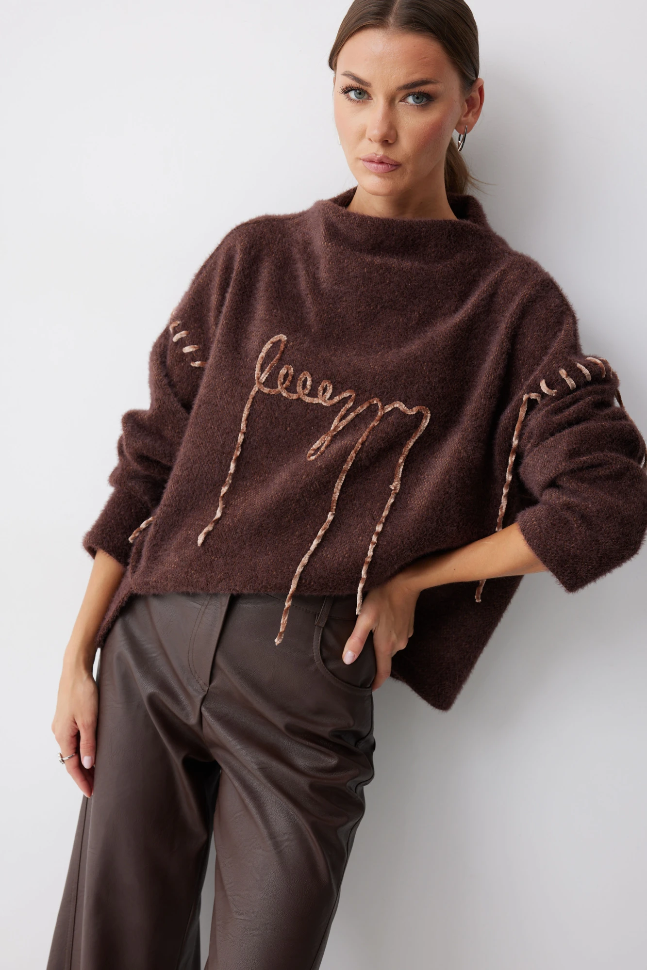 Джемпер прямого силуэта из трикотажного полотна с фигурным низом. Горловина цельнокроеная стойка. Рукав со спущенной линией плеча, удлиненный. Джемпер со смещенным боковым швом. По переду джемпера дизайнерская вышивка.