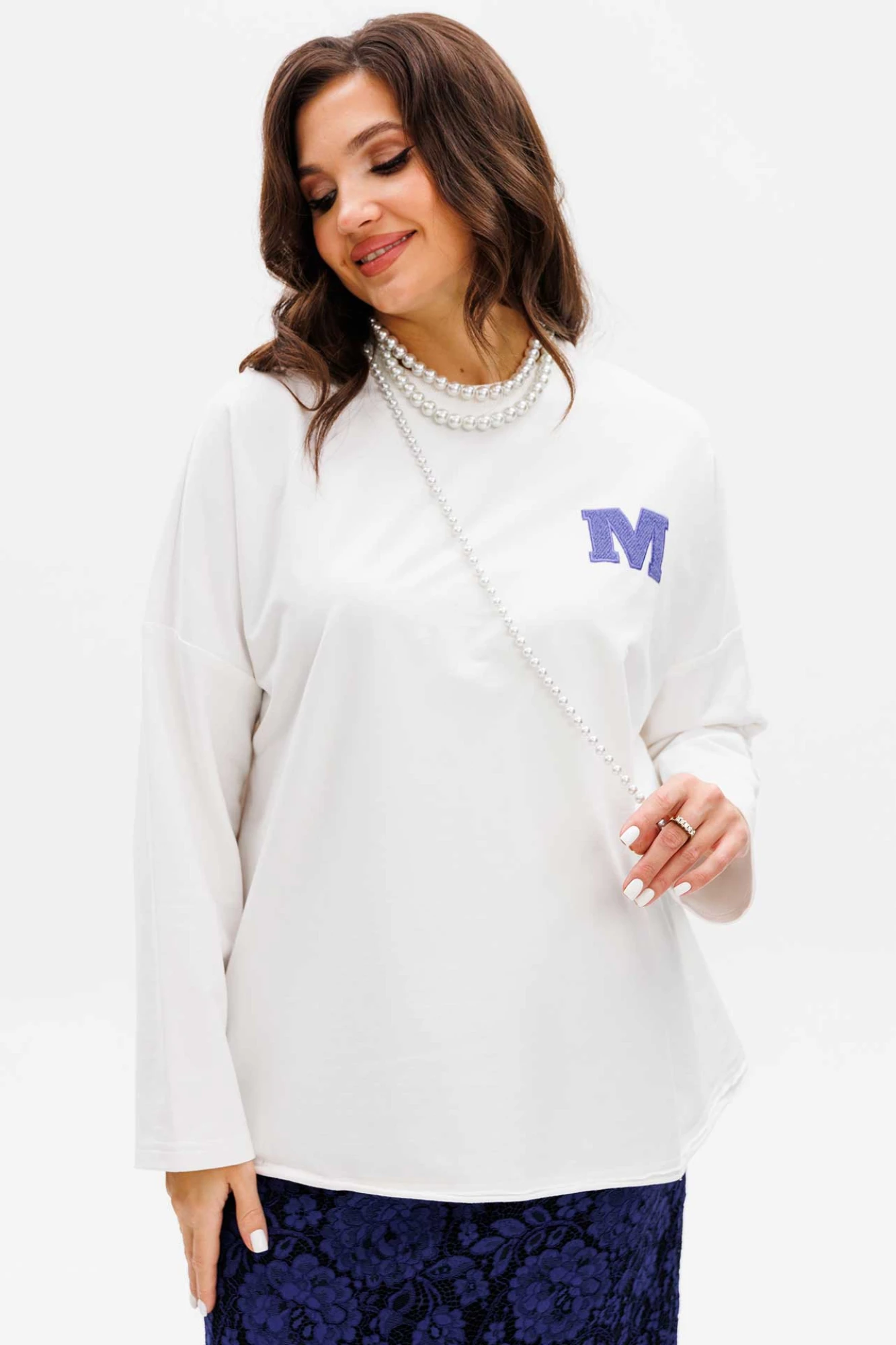 Джемпер свободного силуэта со спущенным плечом, горловина обработана довязом. По низу изделия проходит декоративная не обработанная тесьма-планка с "трепкой". Украшает джемпер апликация в виде буквы "М".
