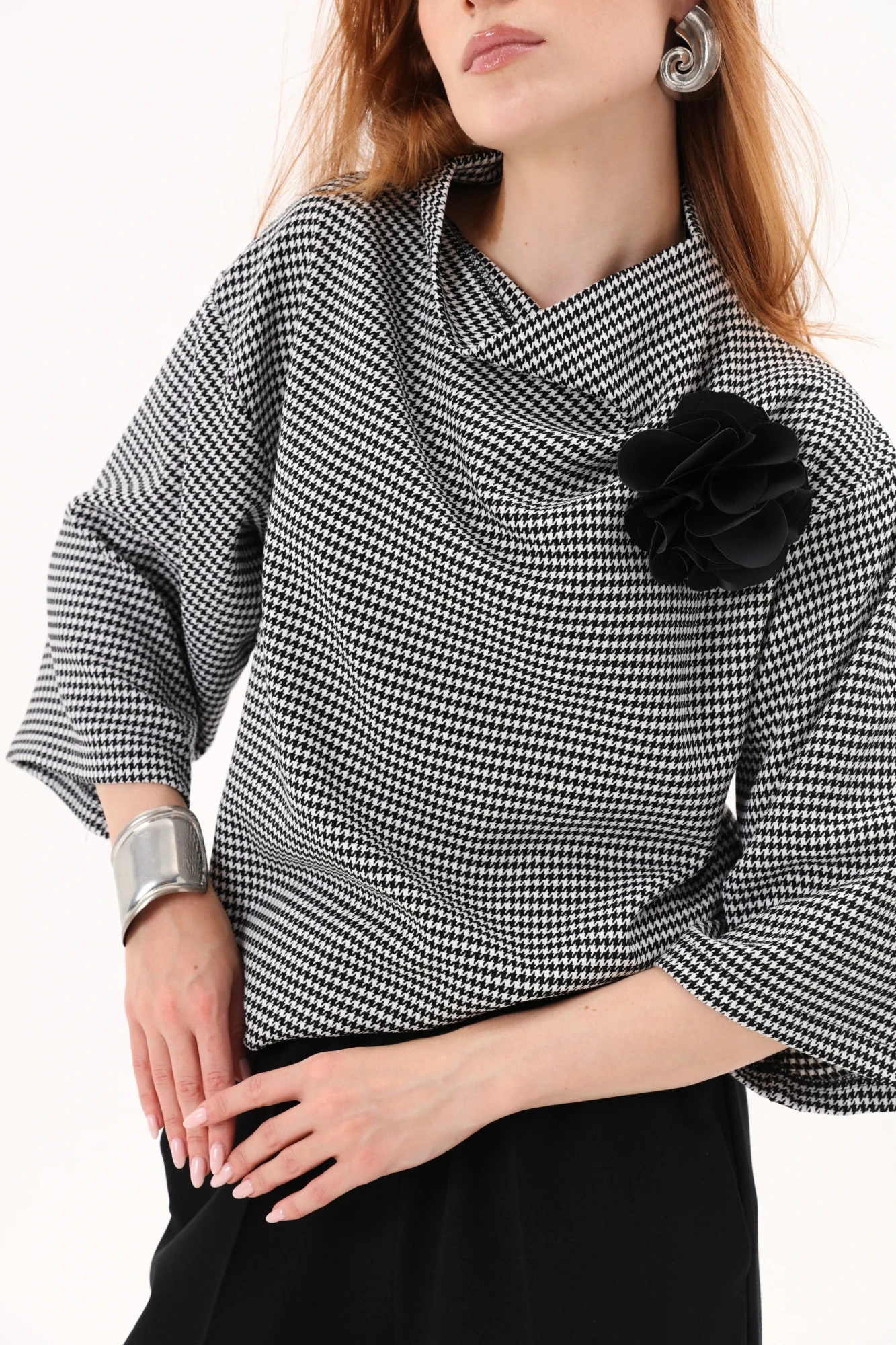 Джемпер прямого свободного силуэта. Горловина с цельнокроеным воротником-стойкой. Рукав втачной широкий, три четверти. В комплект входит съёмная авторская брошь-цветок ручной работы.