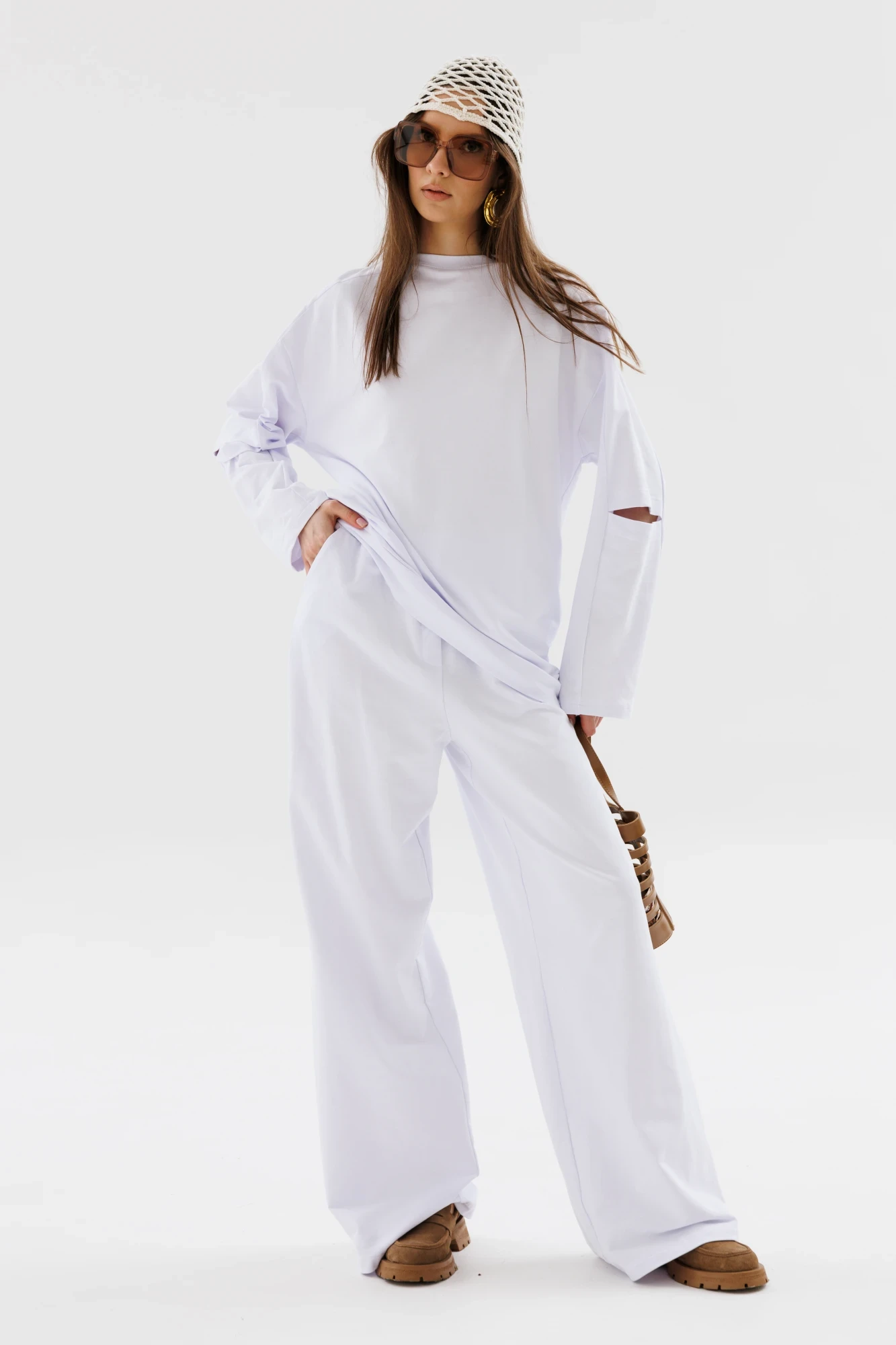 Джемпер свободного силуэта с округлой горловиной. Рукав комбинированного кроя, с передними и задними швами. Верхняя и нижняя часть рукава образуют между собой разрез. По спинке изделие декорировано авторским вязаным элементом ручной работы.