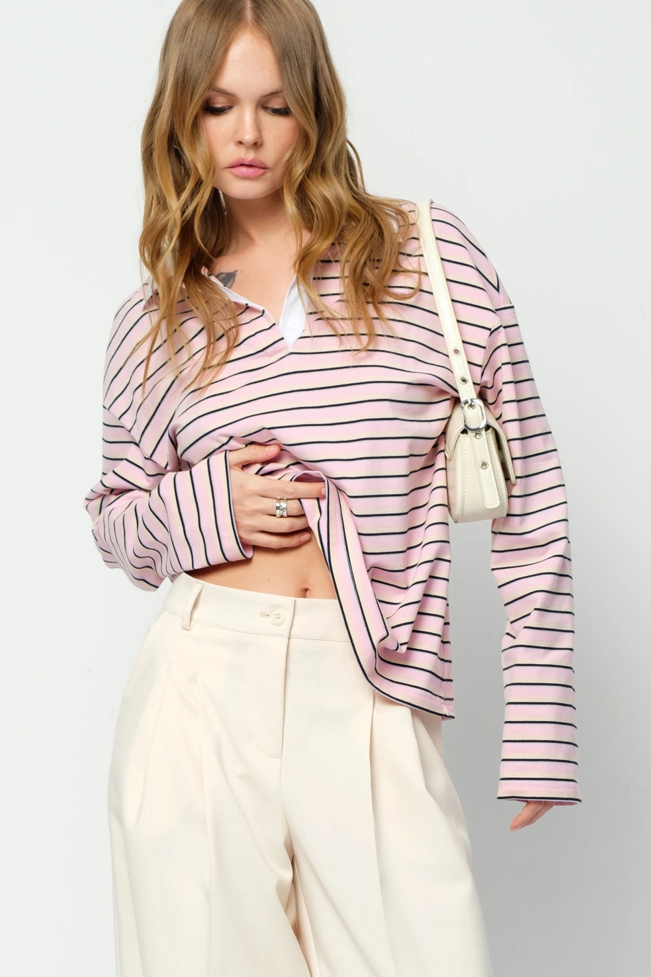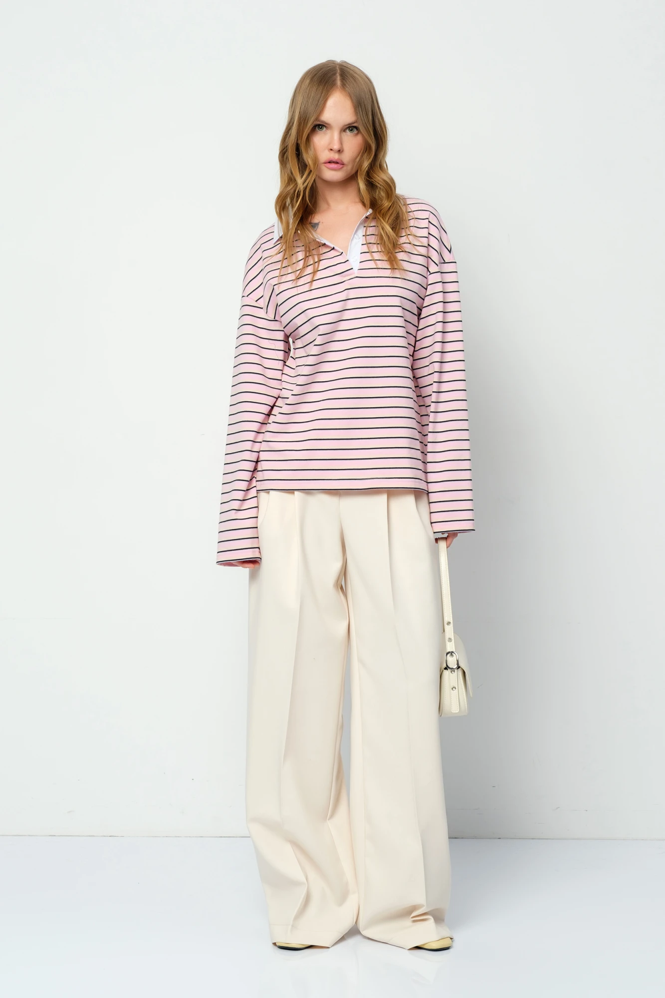 Свободный трикотажный джемпер в полоску с контрастным воротником-поло. Детали: поло прямого силуэта, спущенная линия плеча, потайная застежка на петли и пуговицы, длинные рукава воротник контрастного цвета из текстильной хлопковой ткани. Длина по спинке около 58 в размерах 40-46 и около 60 см в размерах 48-52, длина рукава+ плечо около 51,5+9 см.