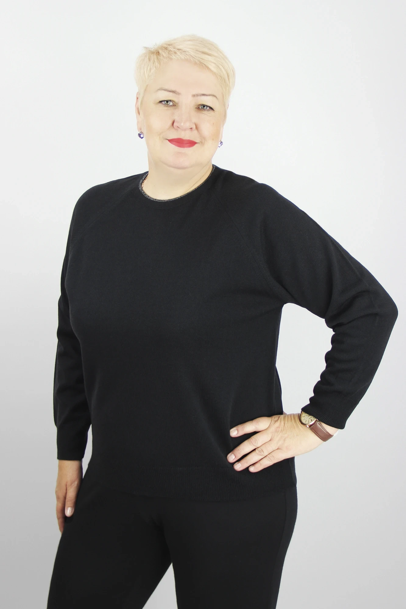 Джемпер прямого силуэта с длинным рукавом "реглан". Круглый вырез горловины обработан притачной бейкой
