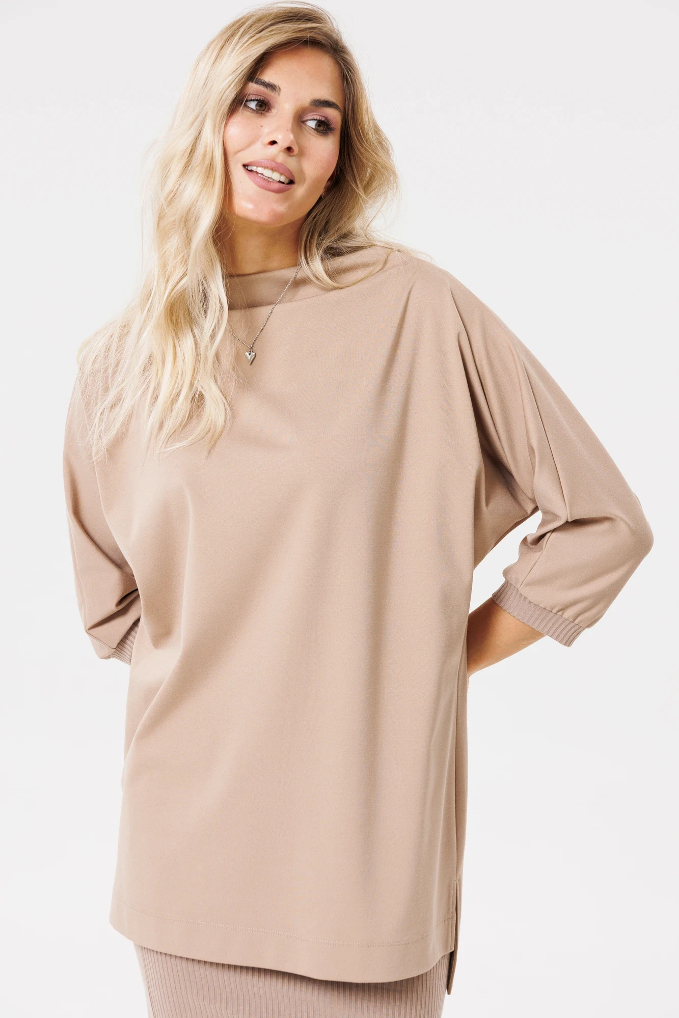Джемпер женский из трикотажной ткани с цельнокроенным рукавом. Перед короче спинки, в боковых швах расположены разрезы. Низ рукава обработан притачной манжетой из отделочной ткани. Вырез горловины обработан цельнокроенной обтачкой.