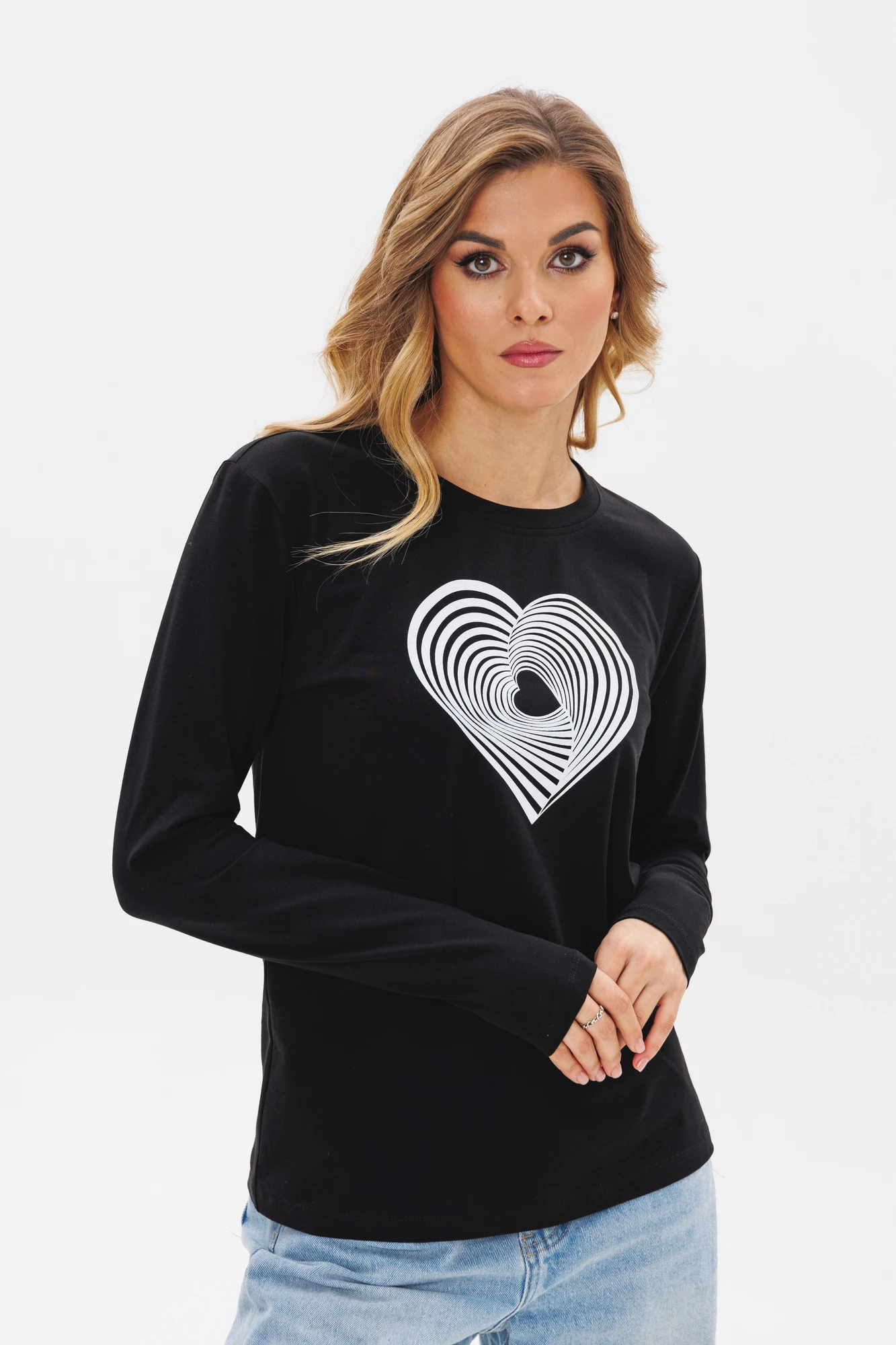 Лонгслив женский полуприлегающего силуэта из трикотажной ткани. По переду расположен принт. Рукав втачной, одношовный. Вырез горловины круглый.