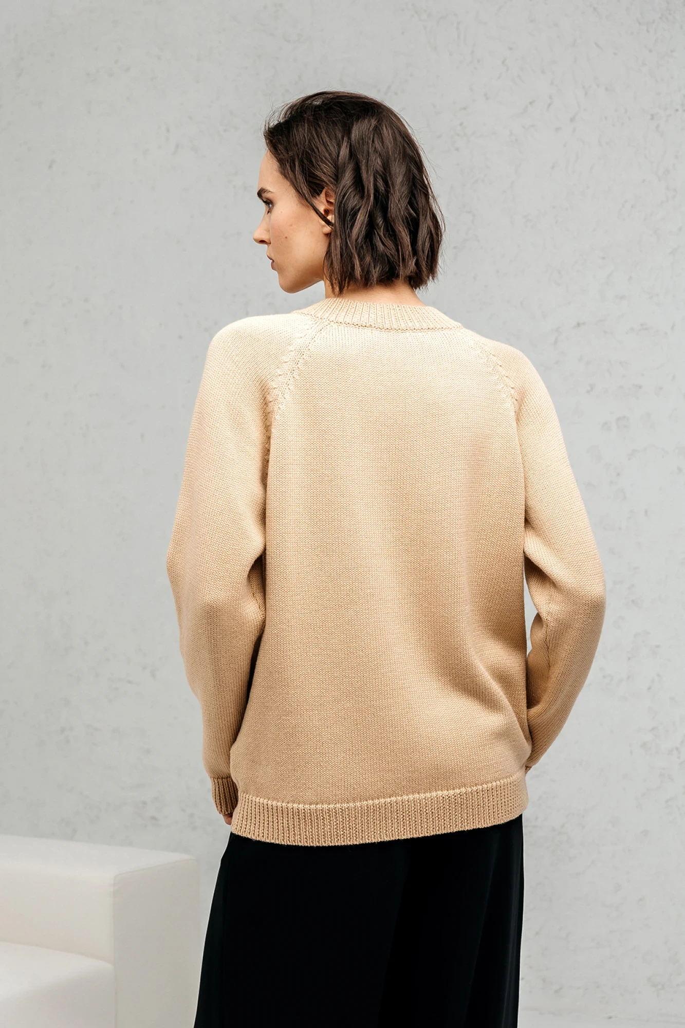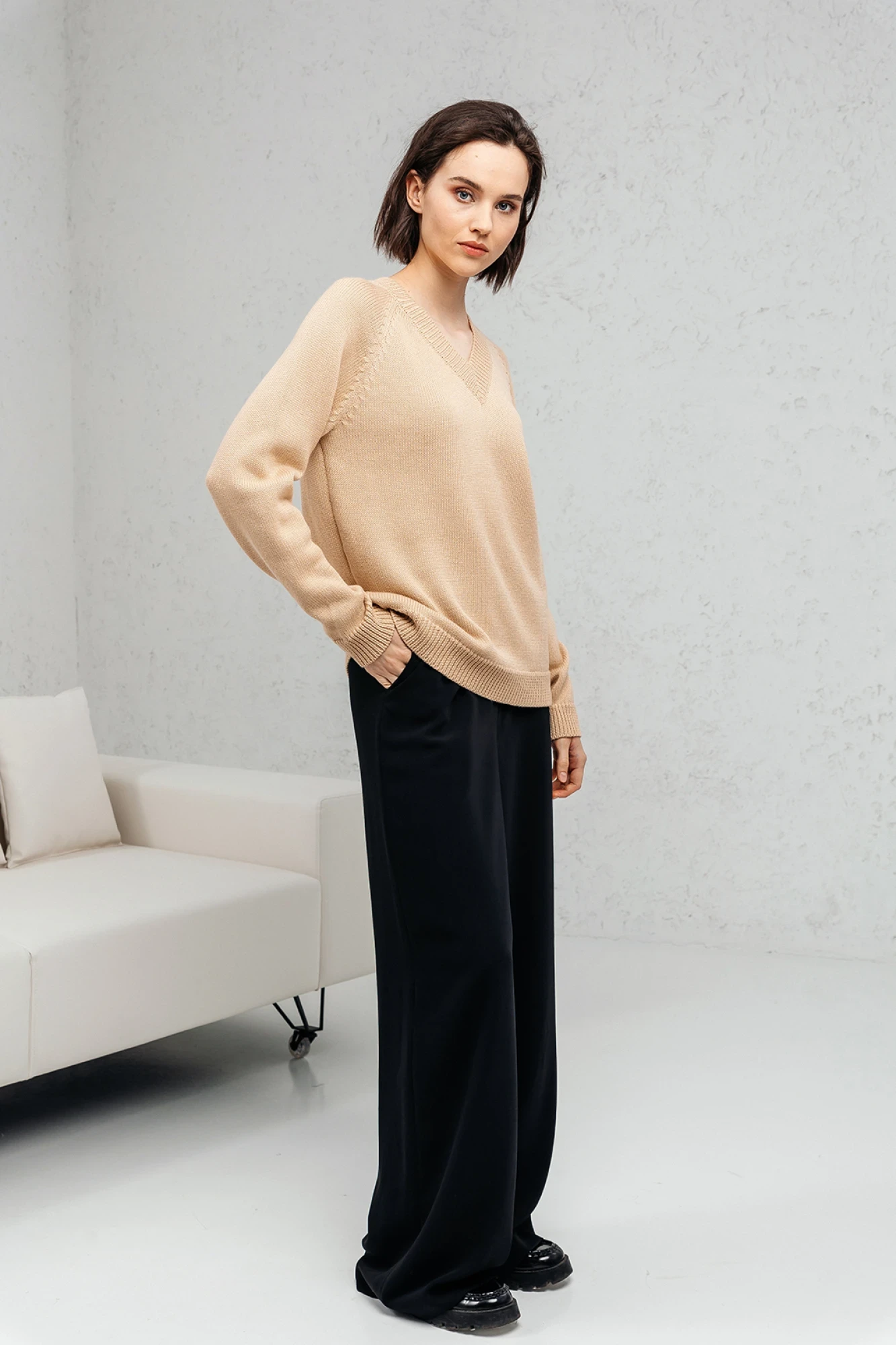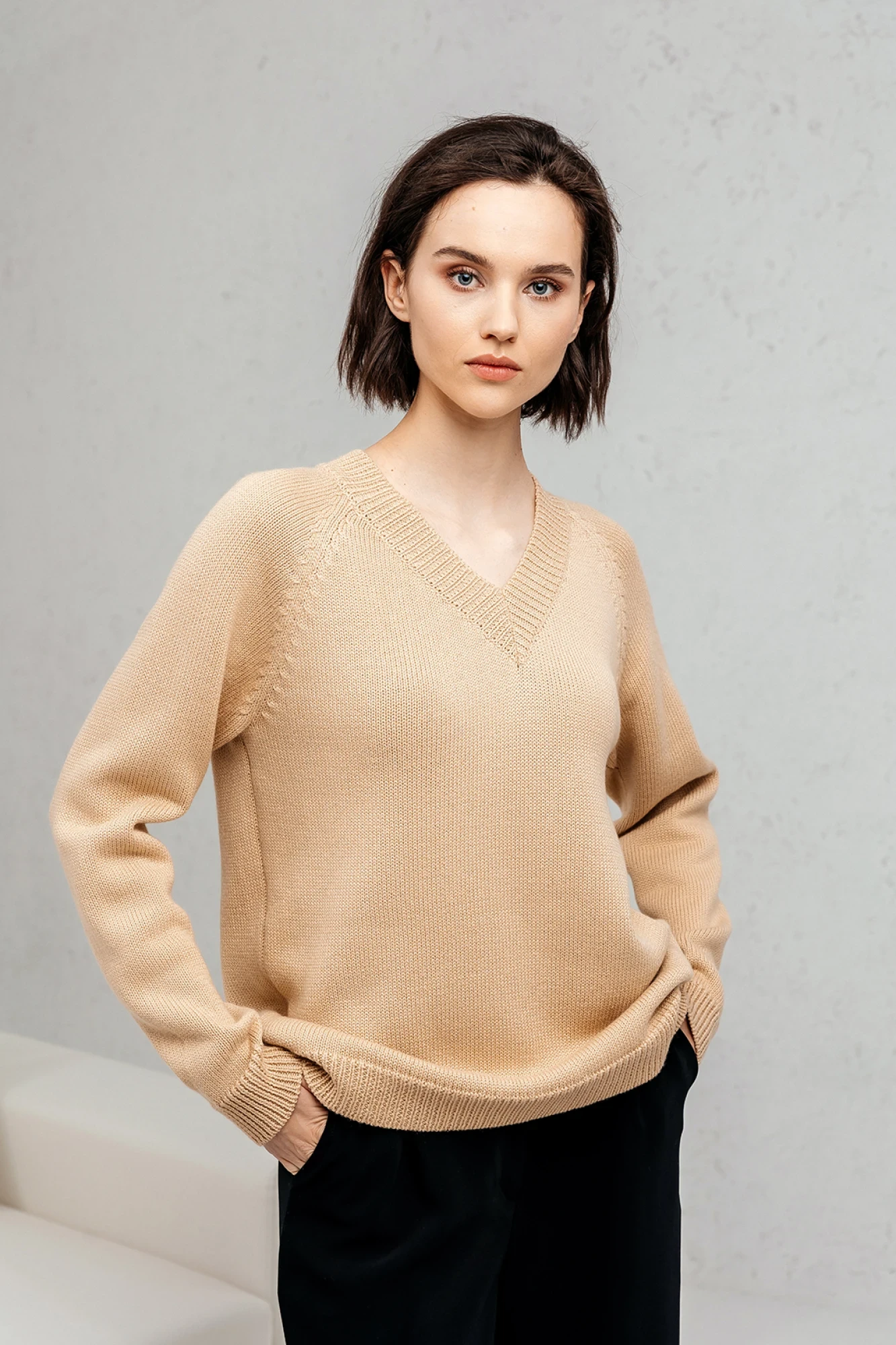 Джемпер прямого силуэта со спущенной линией плеча. Рукав длинный. Форма горловины переда - V-образная обработана накеттлеванной бейкой. Джемпер связан переплетением "кулирная гладь", низ изделия и низ рукавов связаны переплетением ластик.