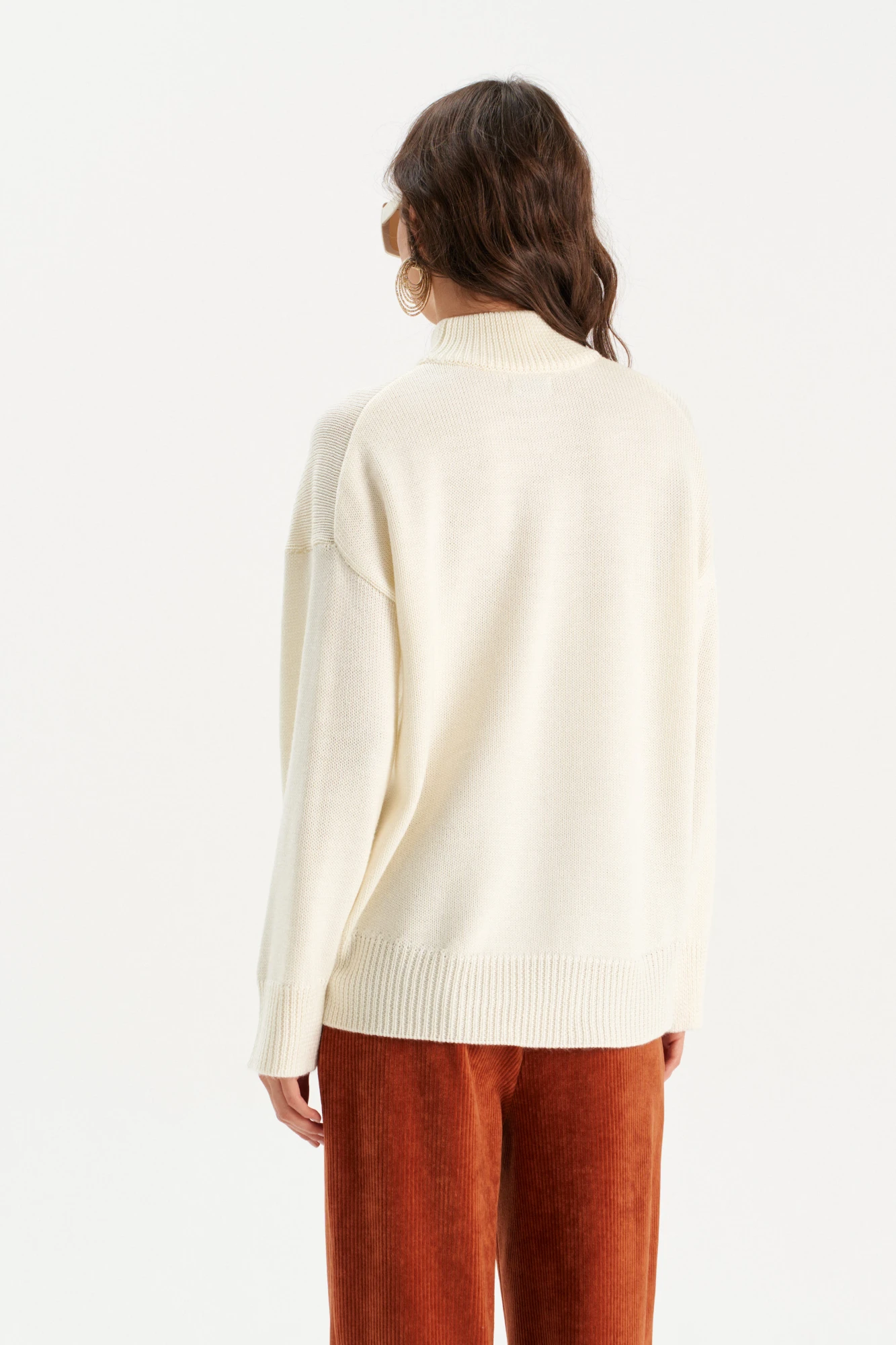 Стильный дизайн: Высокий ворот и слегка удлинённый крой делают джемпер универсальным для создания различных образов — от повседневных до более элегантных.